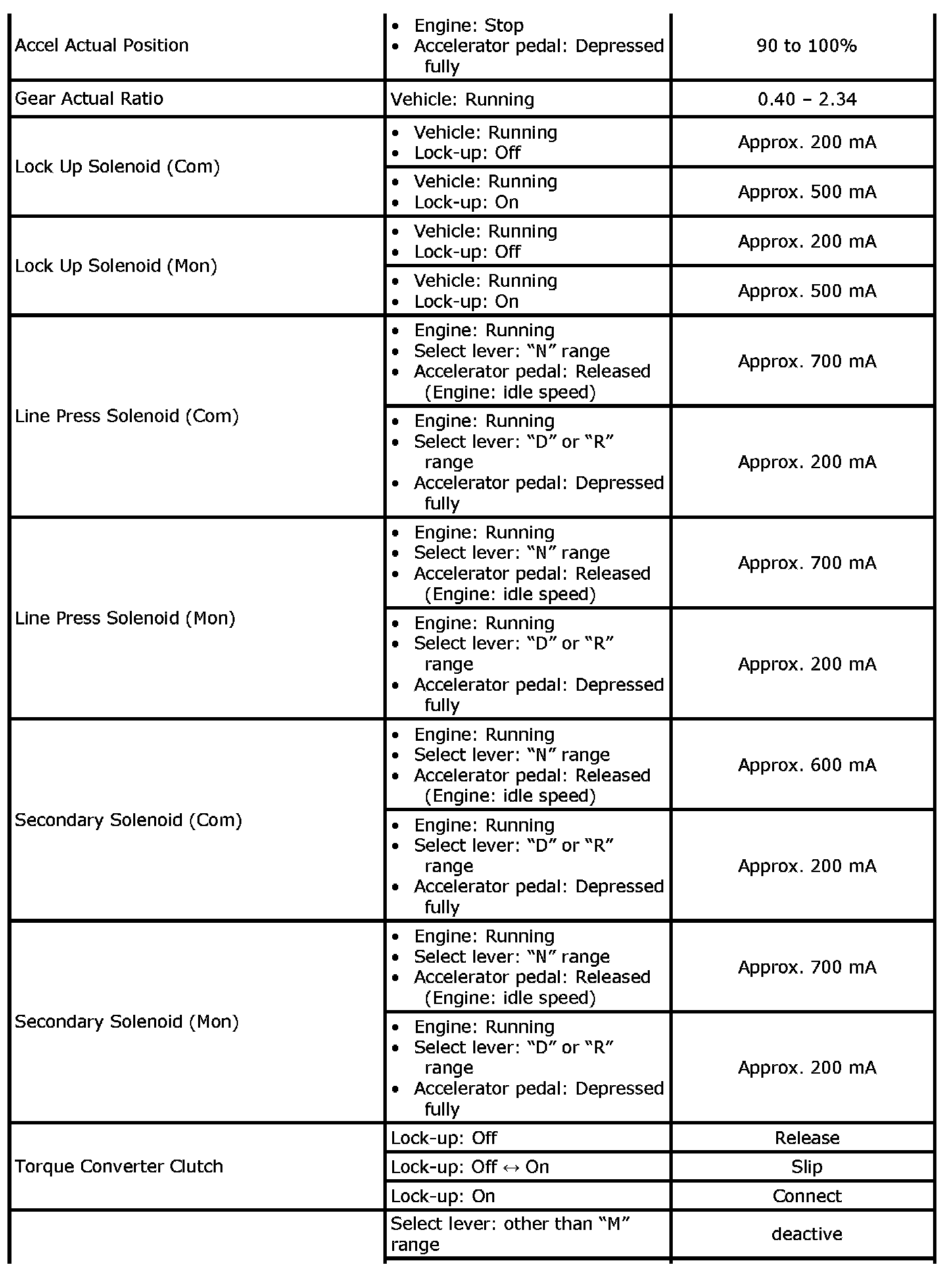 Also, condition in the following table that can be checked by the scan tool are those detected by TCM and output from TCM as commands and there may be cases where the CVT or actuator is not operating (in the condition) as indicated by the scan tool.