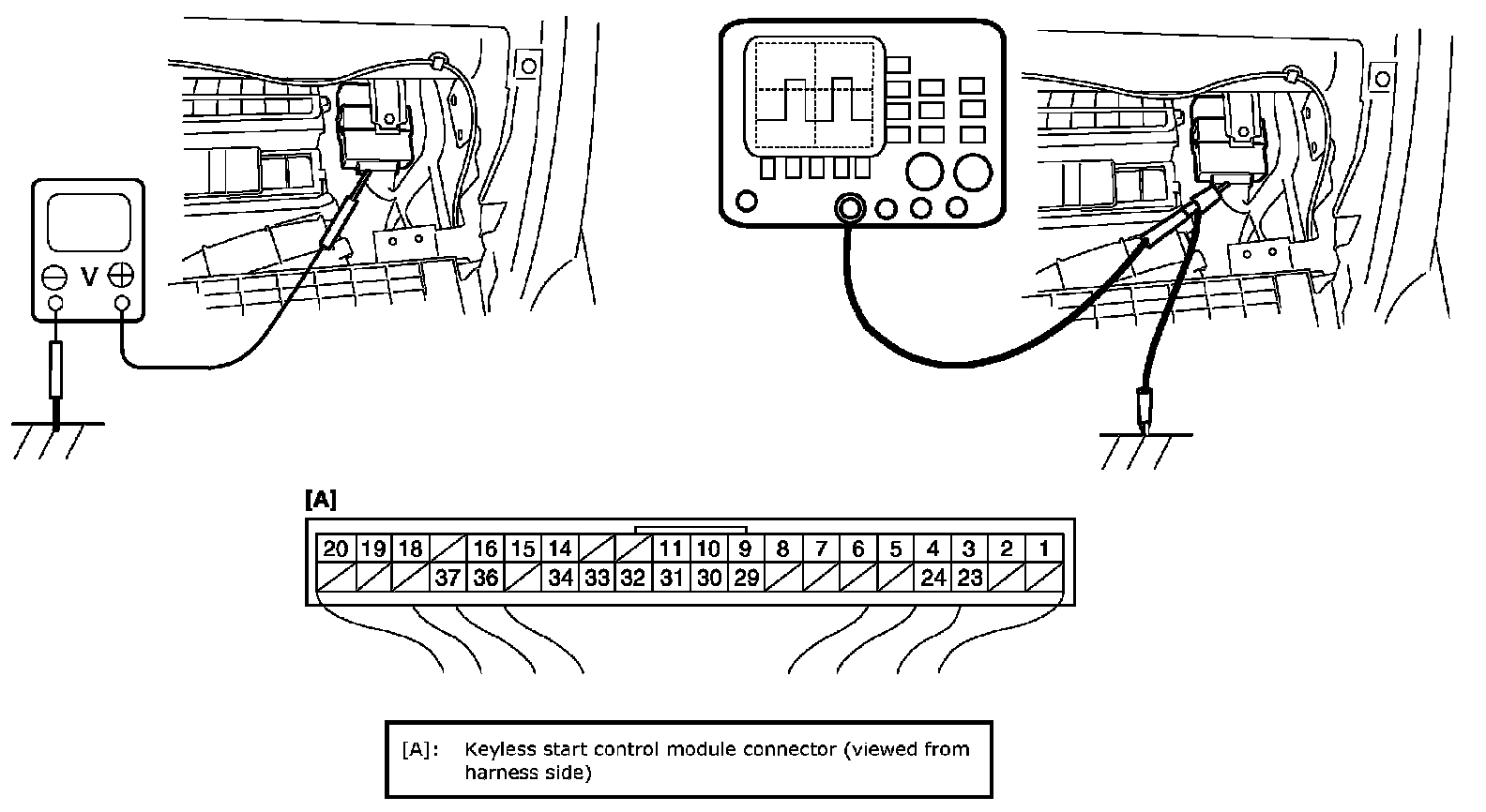 Keyless start control module and its circuits can be checked at keyless start control module wiring couplers by measuring voltage and resistance.