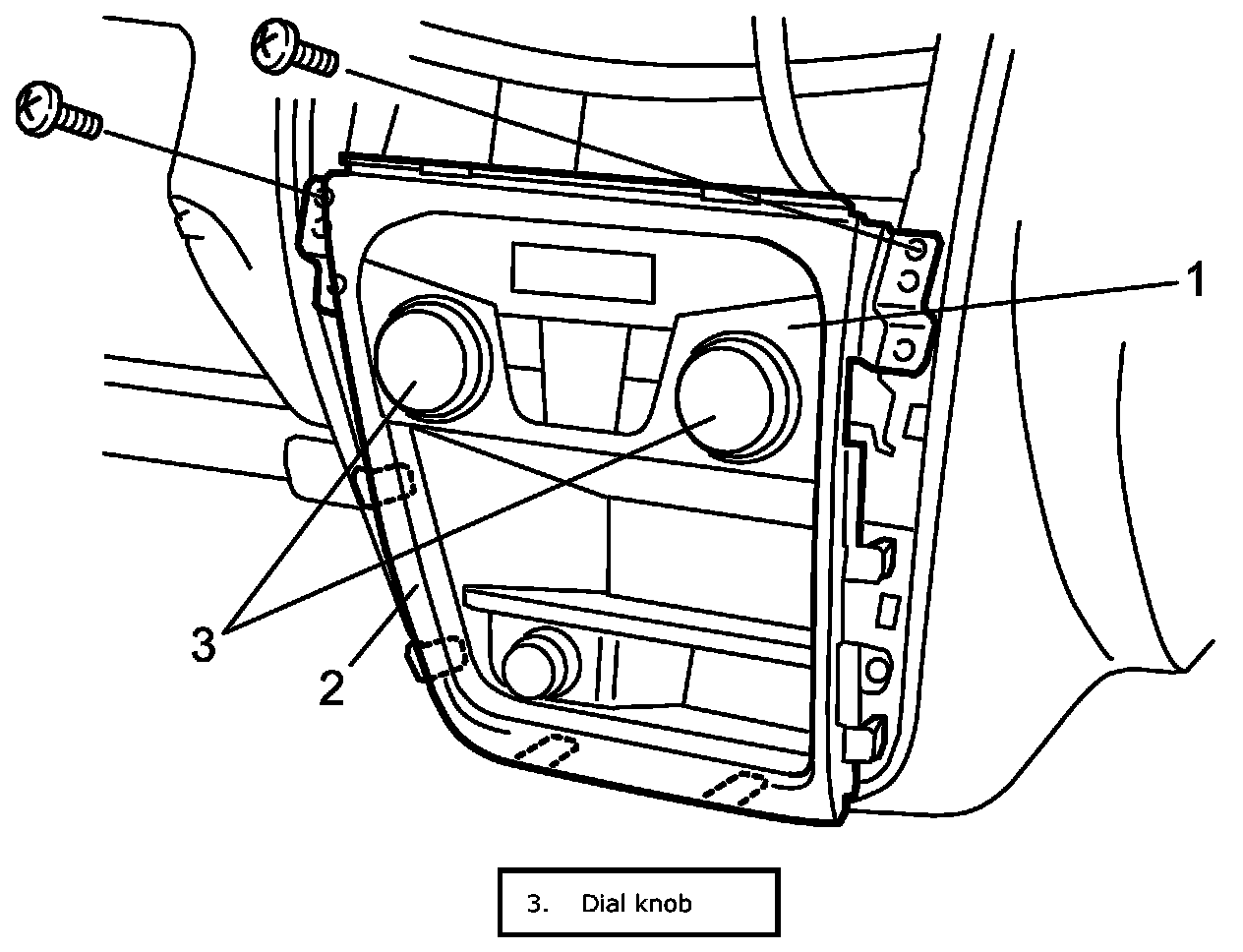 HVAC Control Module Removal and InstallationCAUTION: Do not strongly push dial knobs of A/C switch and air intake switch when removing and installing. Strong push causes panel breakage.