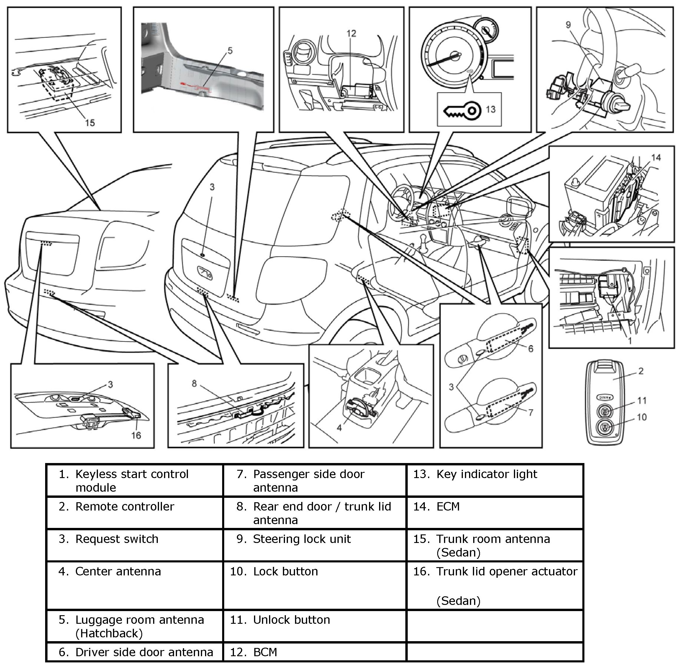 Keyless Start System DescriptionKeyless start system consisting of the parts shown below has four functions as described below.