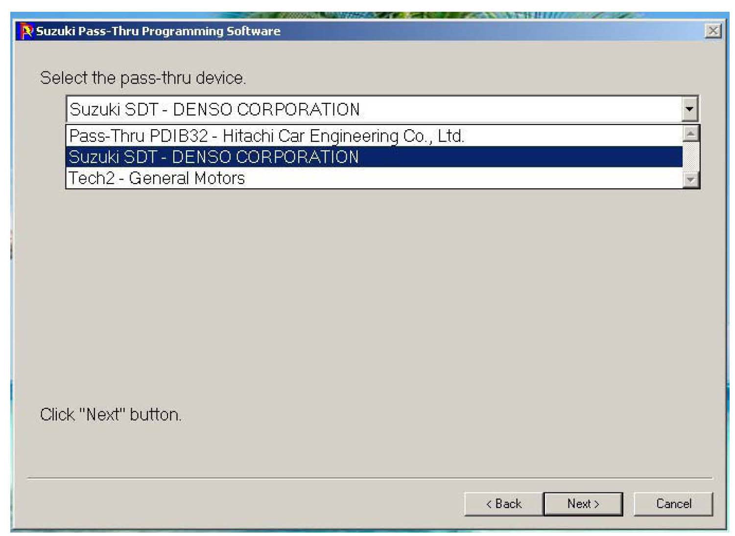 8. Select the "Suzuki SDT DENSO CORPORATION" as the pass-thru device, then click "Next".