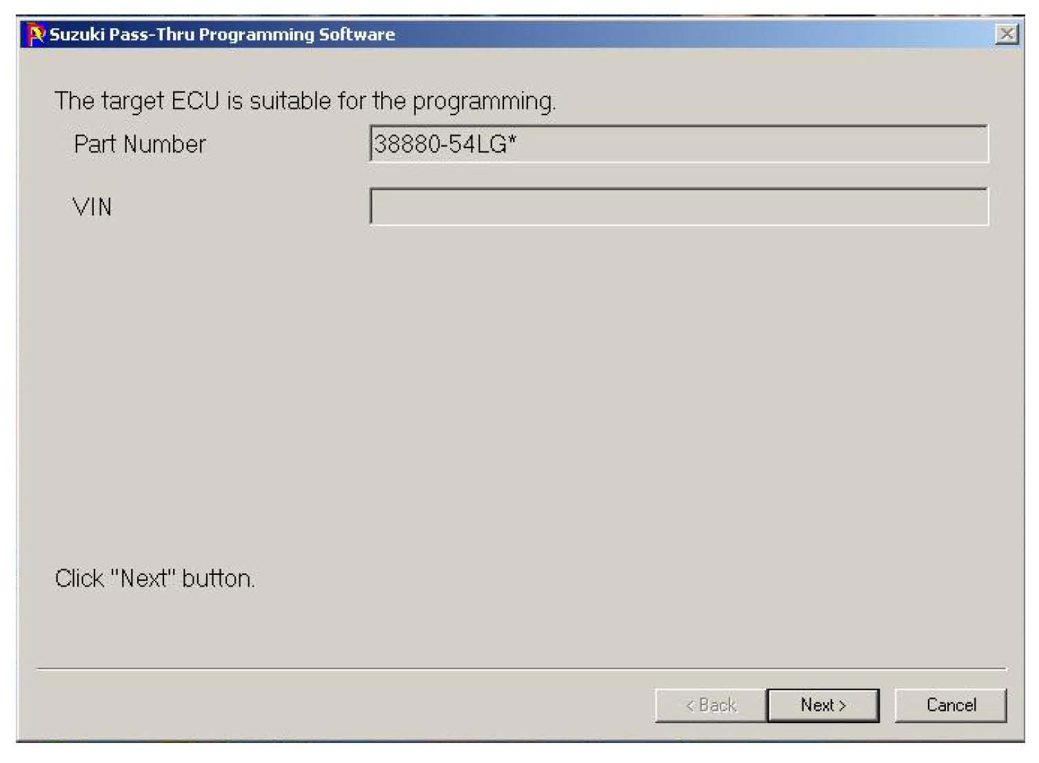 10. Once communication is established, a screen is displayed confirming that the TCM is suitable for reflash. The VIN will not populate nor allow an entry to be made, click the "Next" button.
