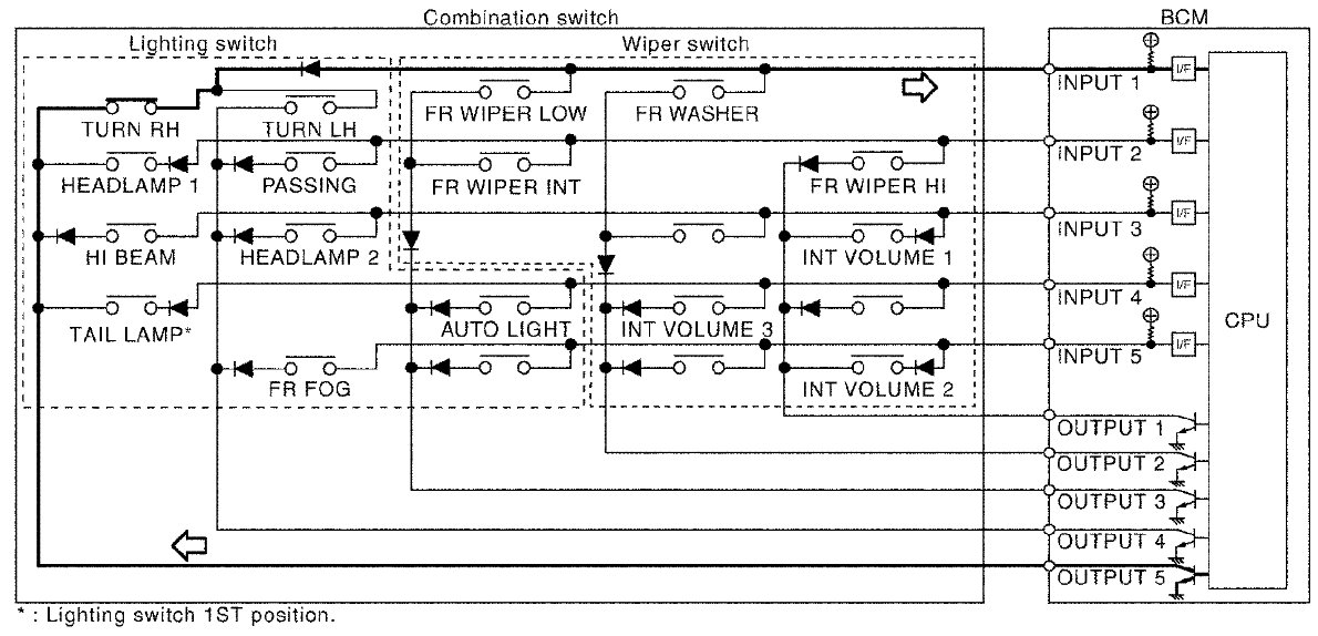 - BCM detects the combination switch status signal "1E" when the signal of OUTPUT 5 is input to INPUT 1.