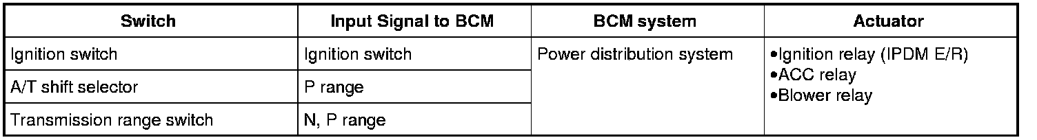 - The ignition switch operation is input to BCM as a signal. BCM changes the power supply position according to the status and operates the ignition relay (inside IPDM E/R) to supply power to each power circuit.