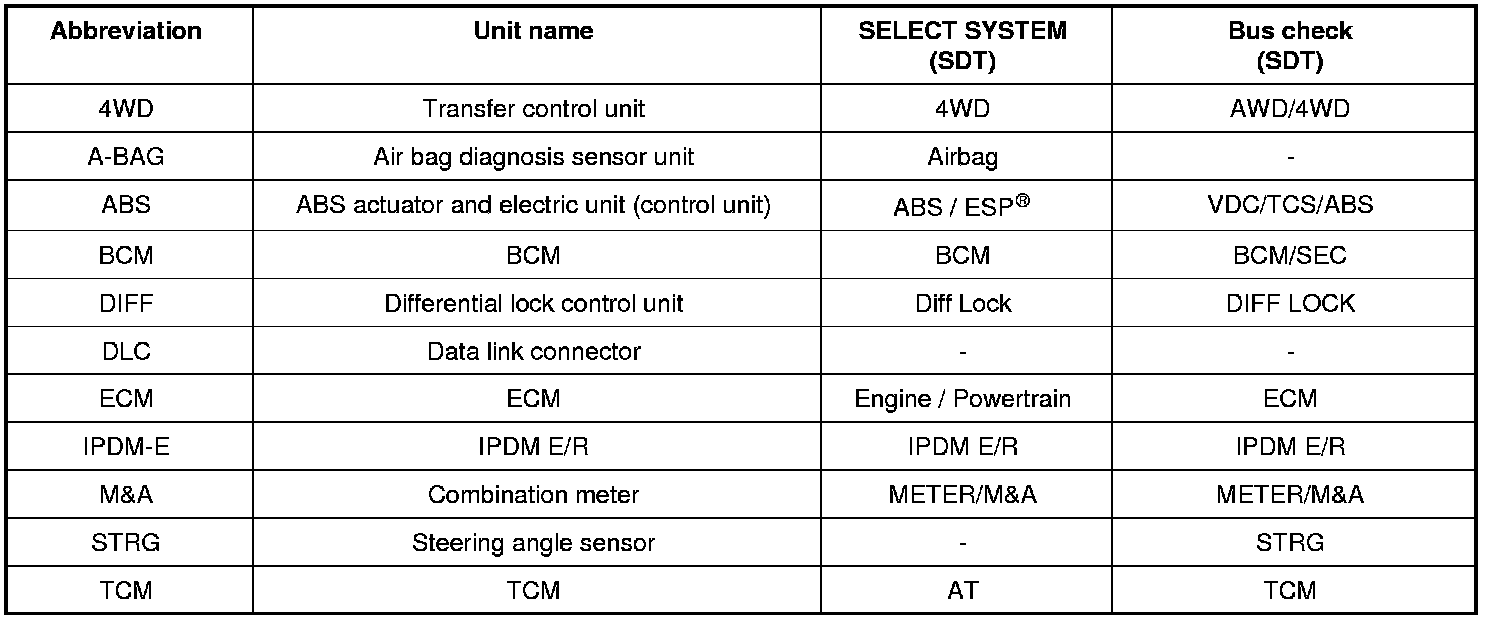 Abbreviation in CAN communication signal chart, and the diagnosis sheet are as per the following list.