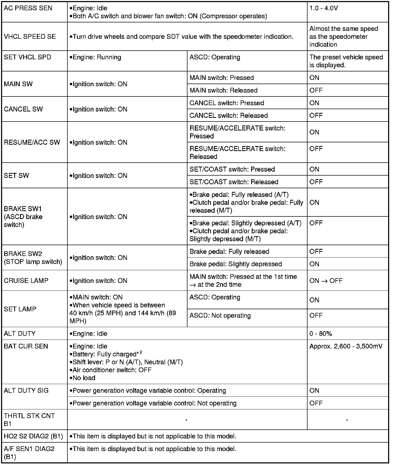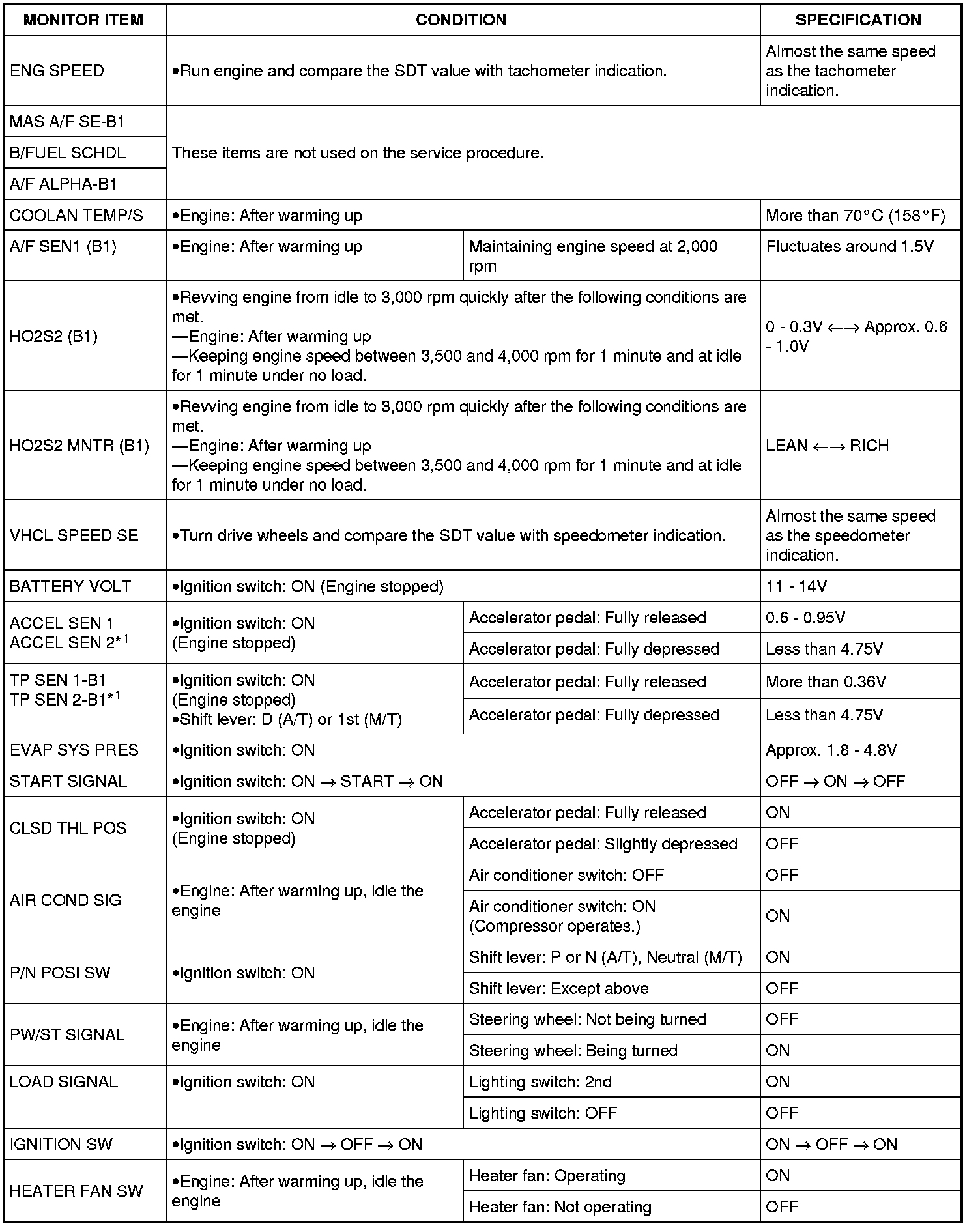*1: Accelerator pedal position sensor 2 signal and throttle position sensor 2 signal are converted by ECM internally. Thus, they differ from ECM terminals voltage signal.