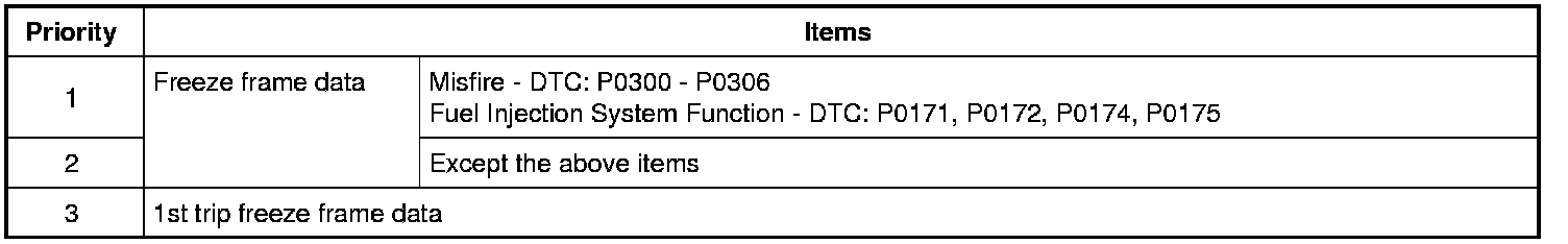 For example, the EGR malfunction (Priority: 2) was detected and the freeze frame data was saved in the 2nd trip. After that when the misfire (Priority: 1) is detected in another trip, the freeze frame data will be updated from the EGR malfunction to the misfire. The 1st trip freeze frame data is updated each time a different malfunction is detected. There is no priority for 1st trip freeze frame data. However, once freeze frame data is stored in the ECM memory, 1st trip freeze data is no longer stored (because only one freeze frame data or 1st trip freeze frame data can be stored in the ECM). If freeze frame data is stored in the ECM memory and freeze frame data with the same priority occurs later, the first (original) freeze frame data remains unchanged in the ECM memory.