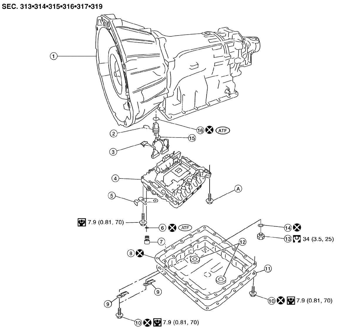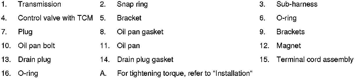30) Install oil pan to transmission case. Refer to [Oil Pan: Removal and Installation] Service and Repair.