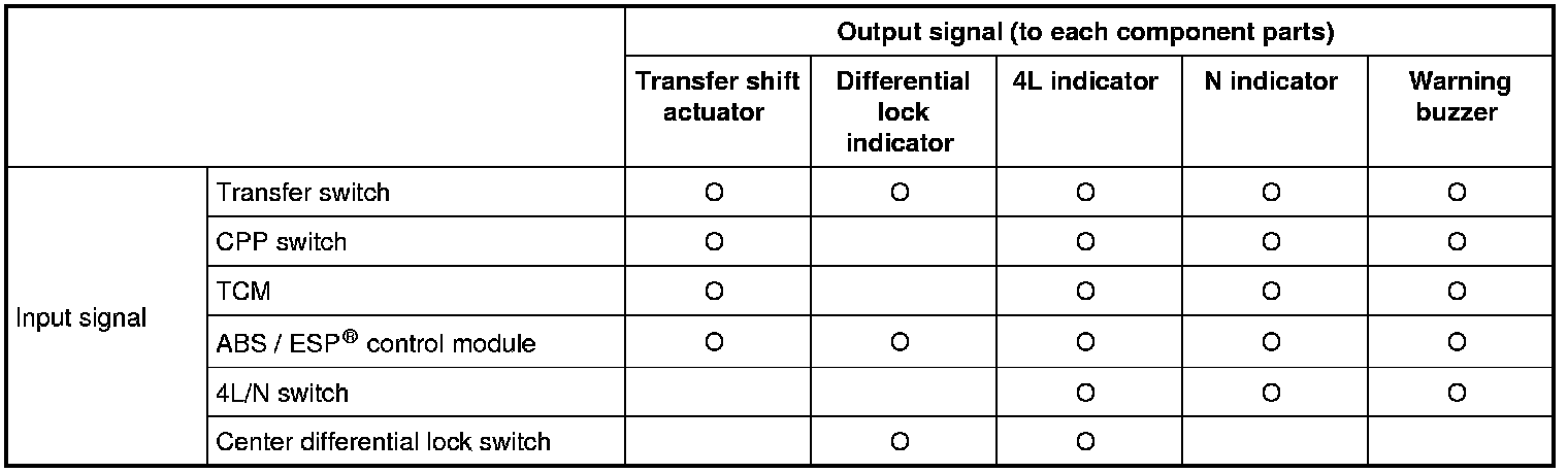 4WD control module outputs the following signals to actuators, indicators, warning buzzer, according to the transfer switch operation.