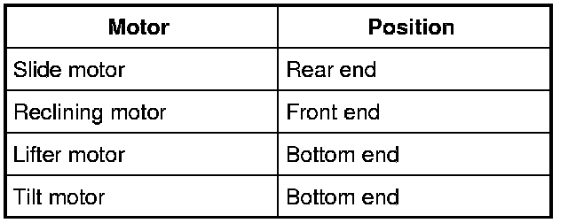 1) Operate each motor, one at a time, to move seat to position indicated in the following table and hold seat at each position for at least 5 seconds.