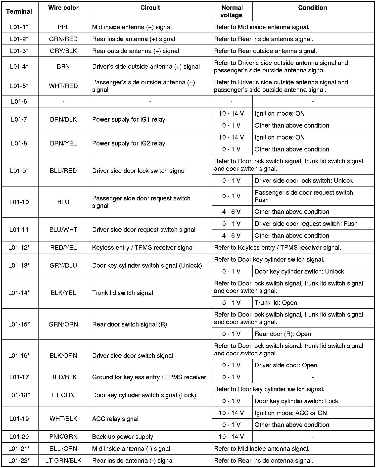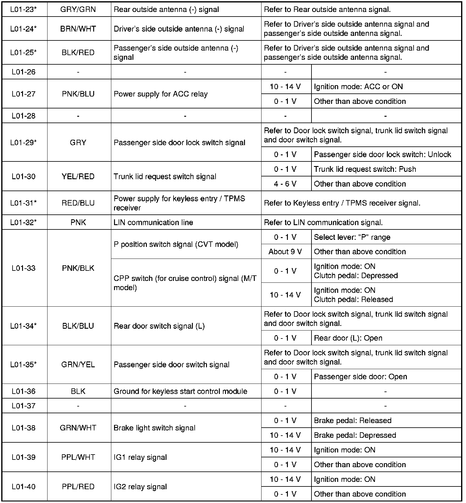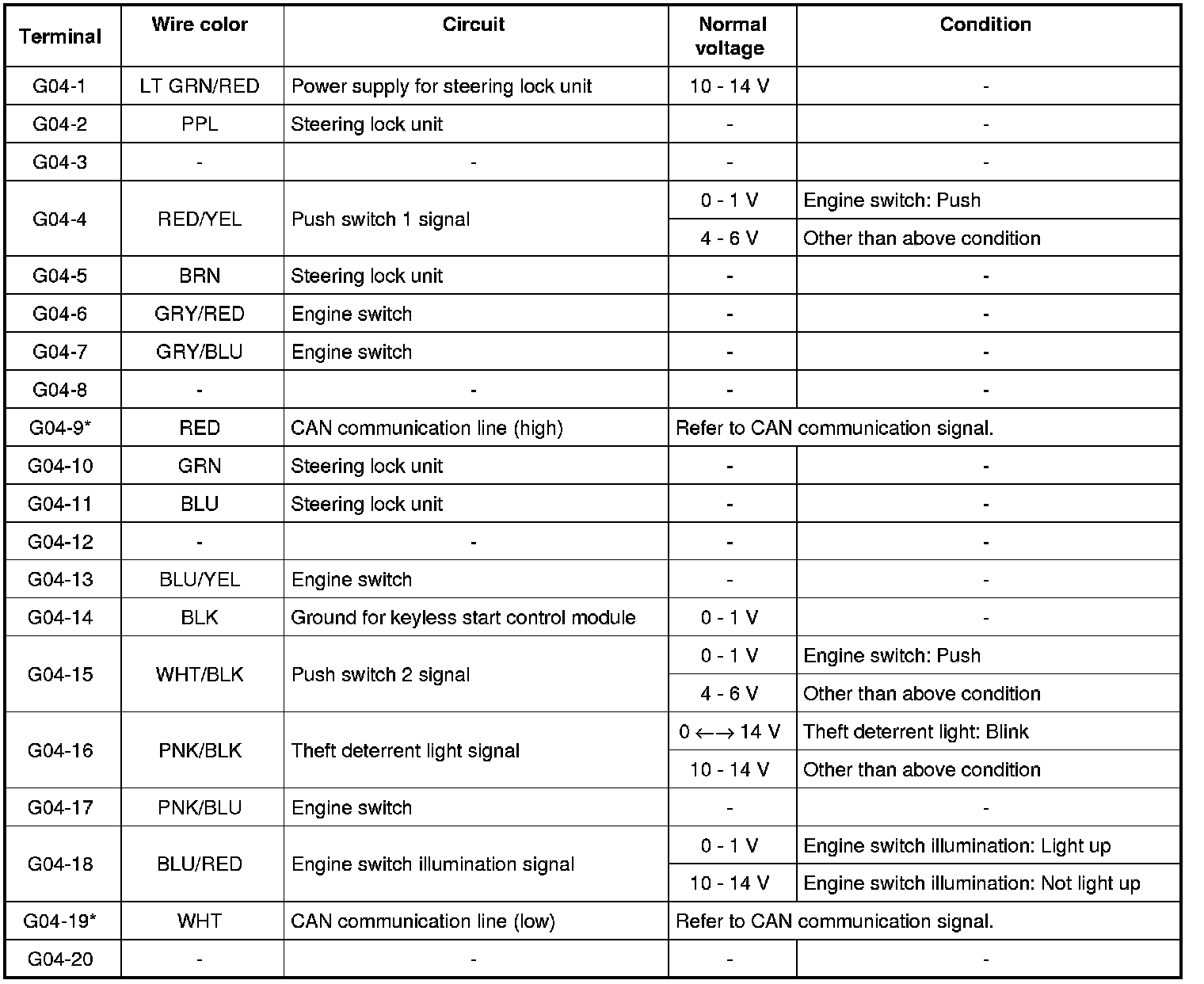 Home >> Suzuki >> 2011 >> Kizashi AWD L4-2.4L >> Repair and Diagnosis >> Starting and Charging >> Starting System >> Keyless Starting System >> Keyless Start Control Module >> Testing and Inspection >> Component Tests and General Diagnostics >> Inspection of Keyless Start Control Module and Its Circuits