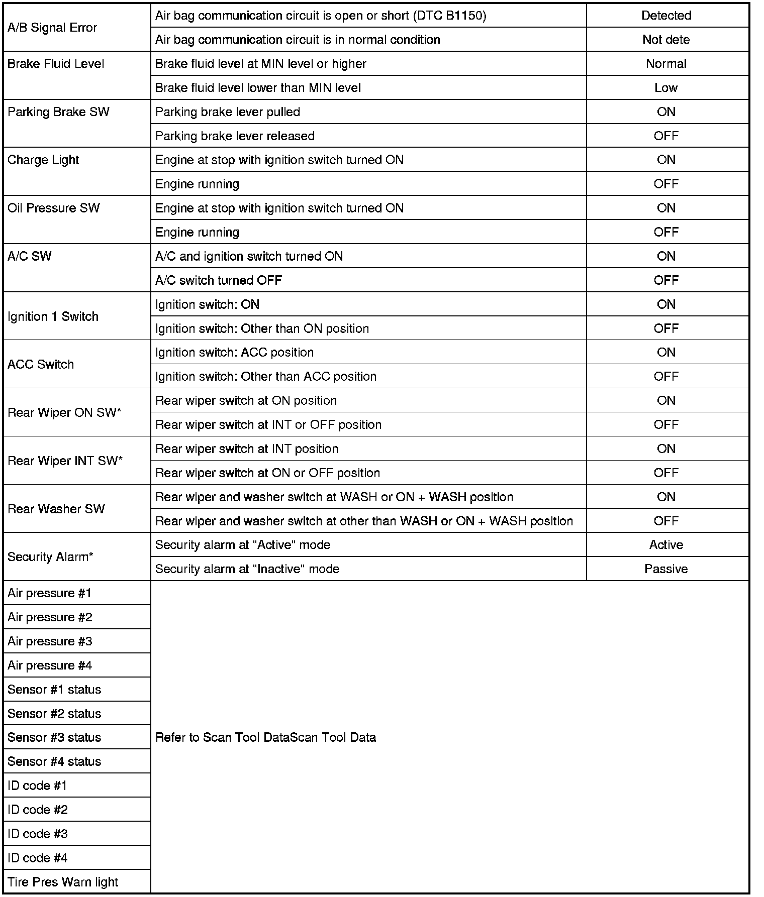 - Not data: Air bag communication circuit in normal condition.
