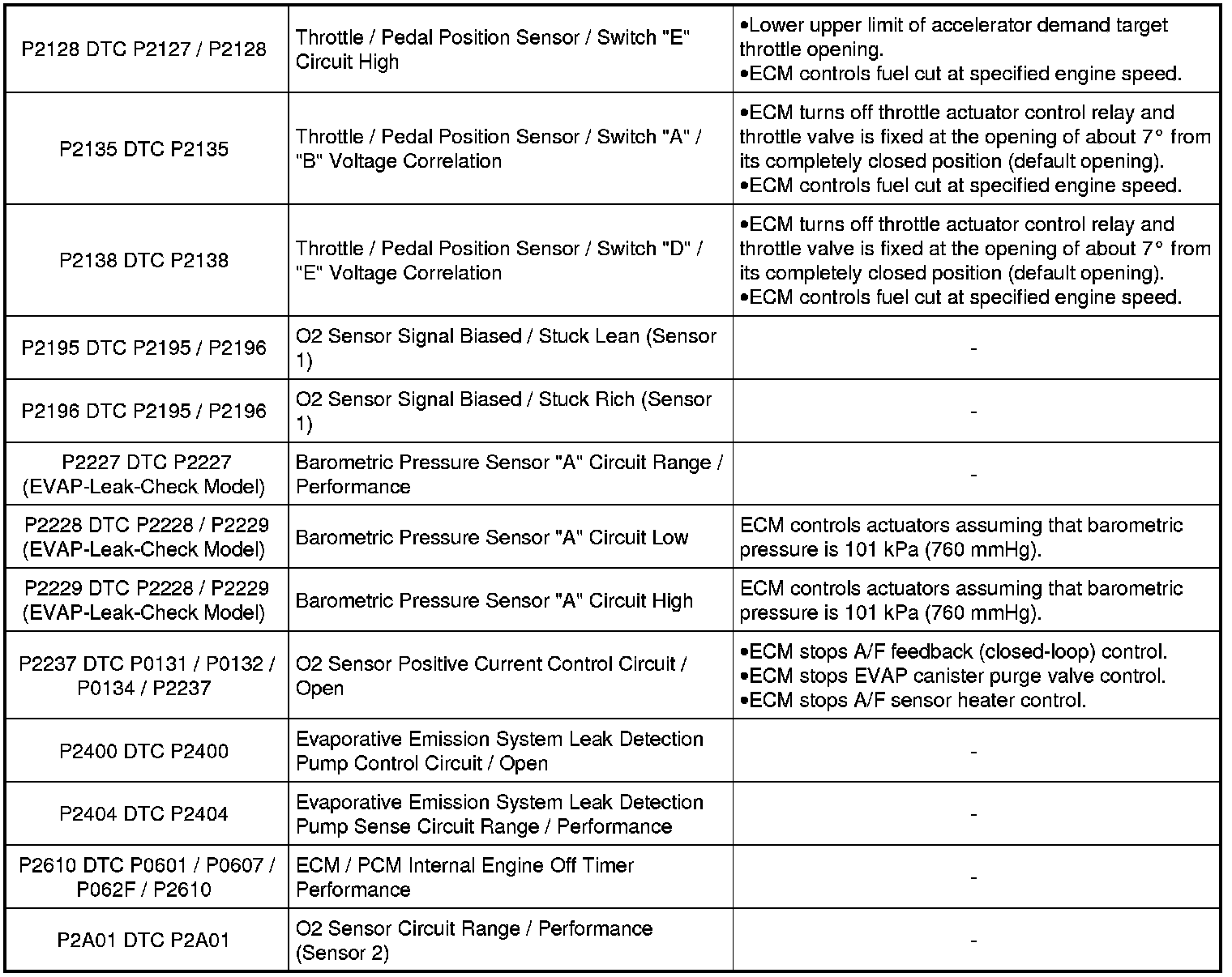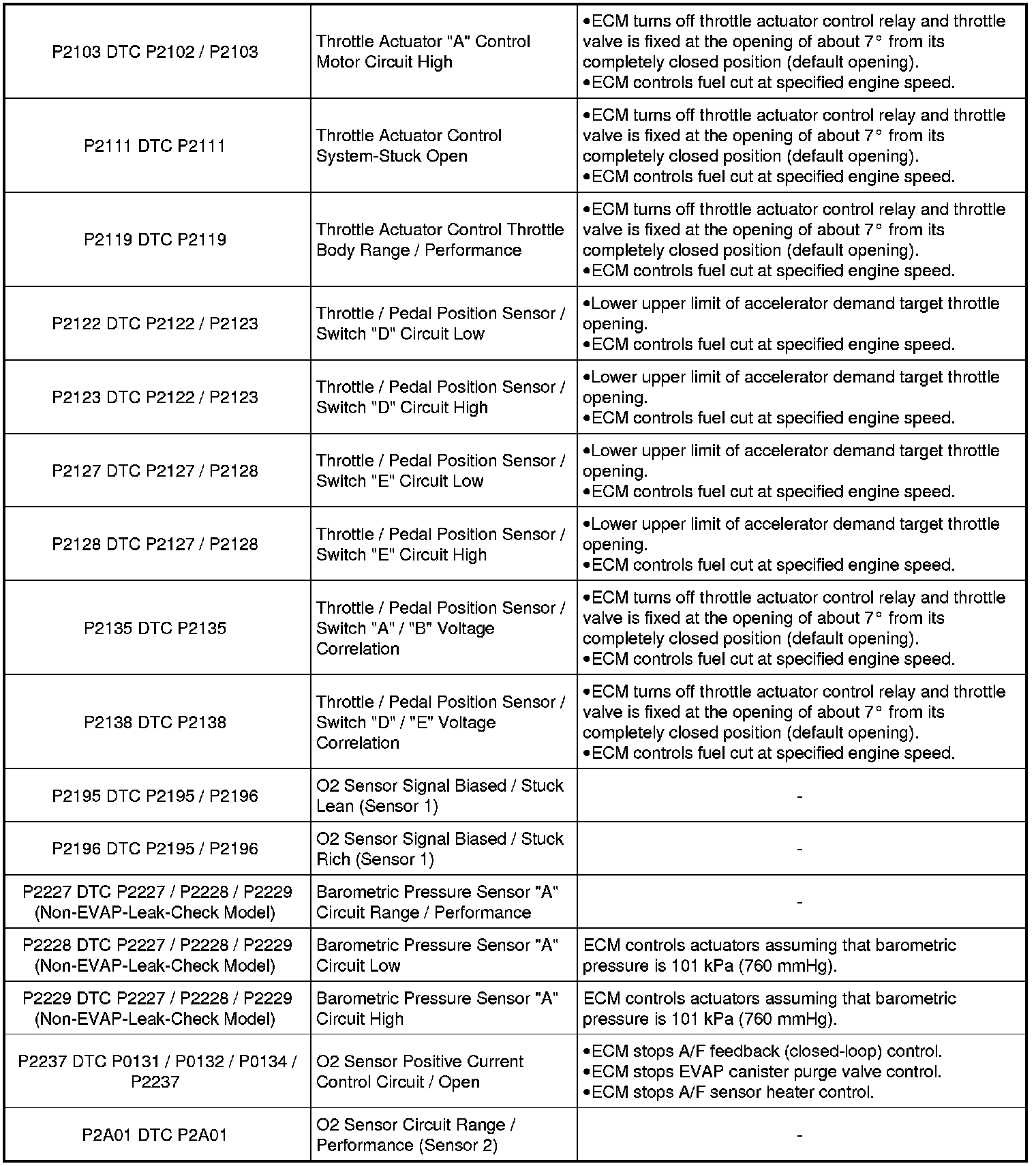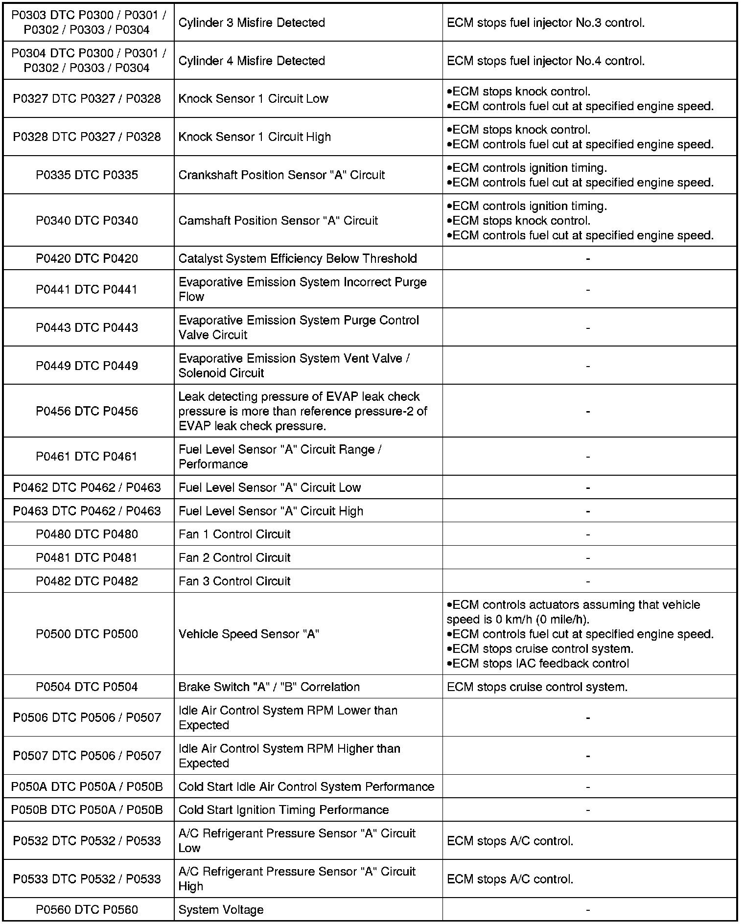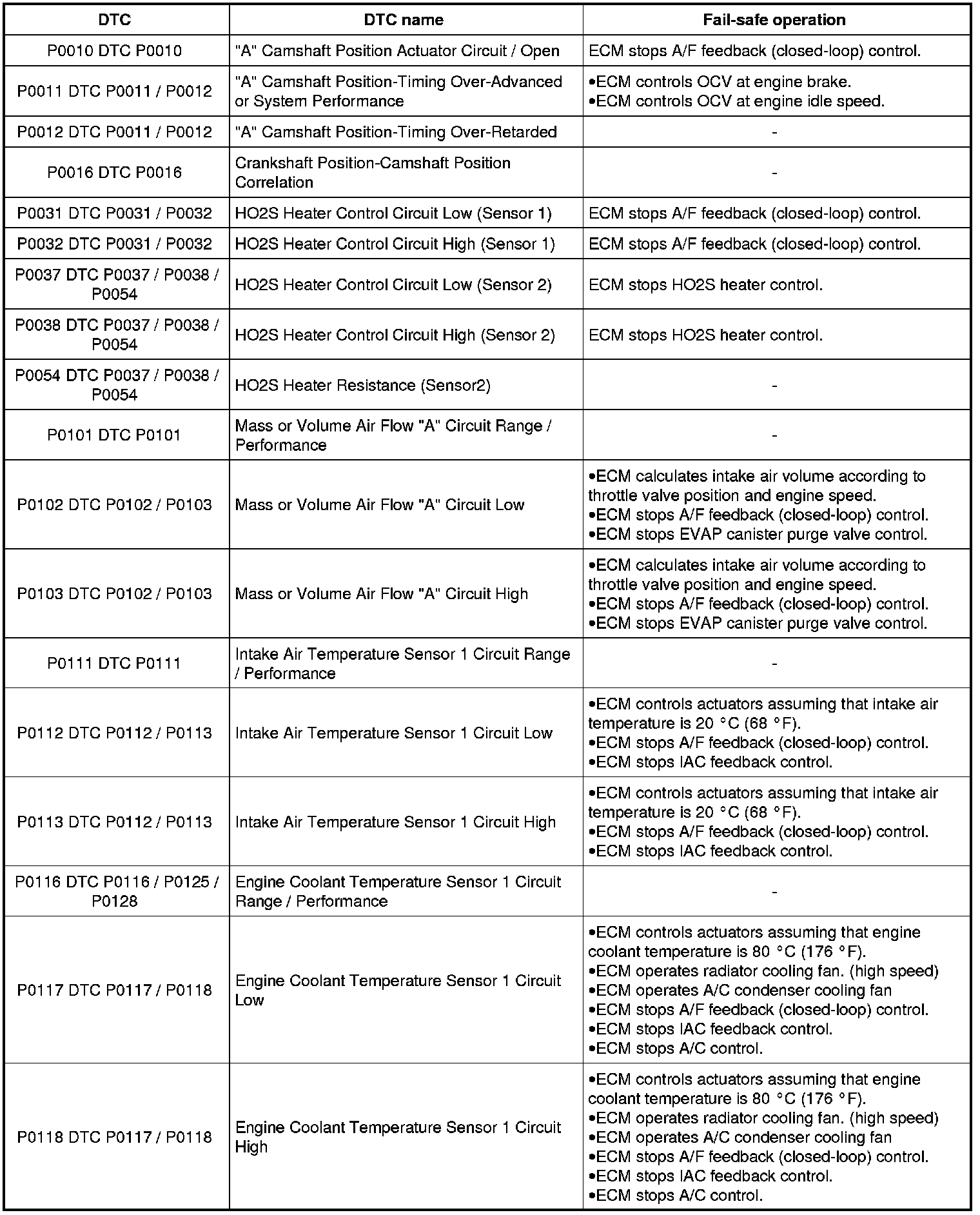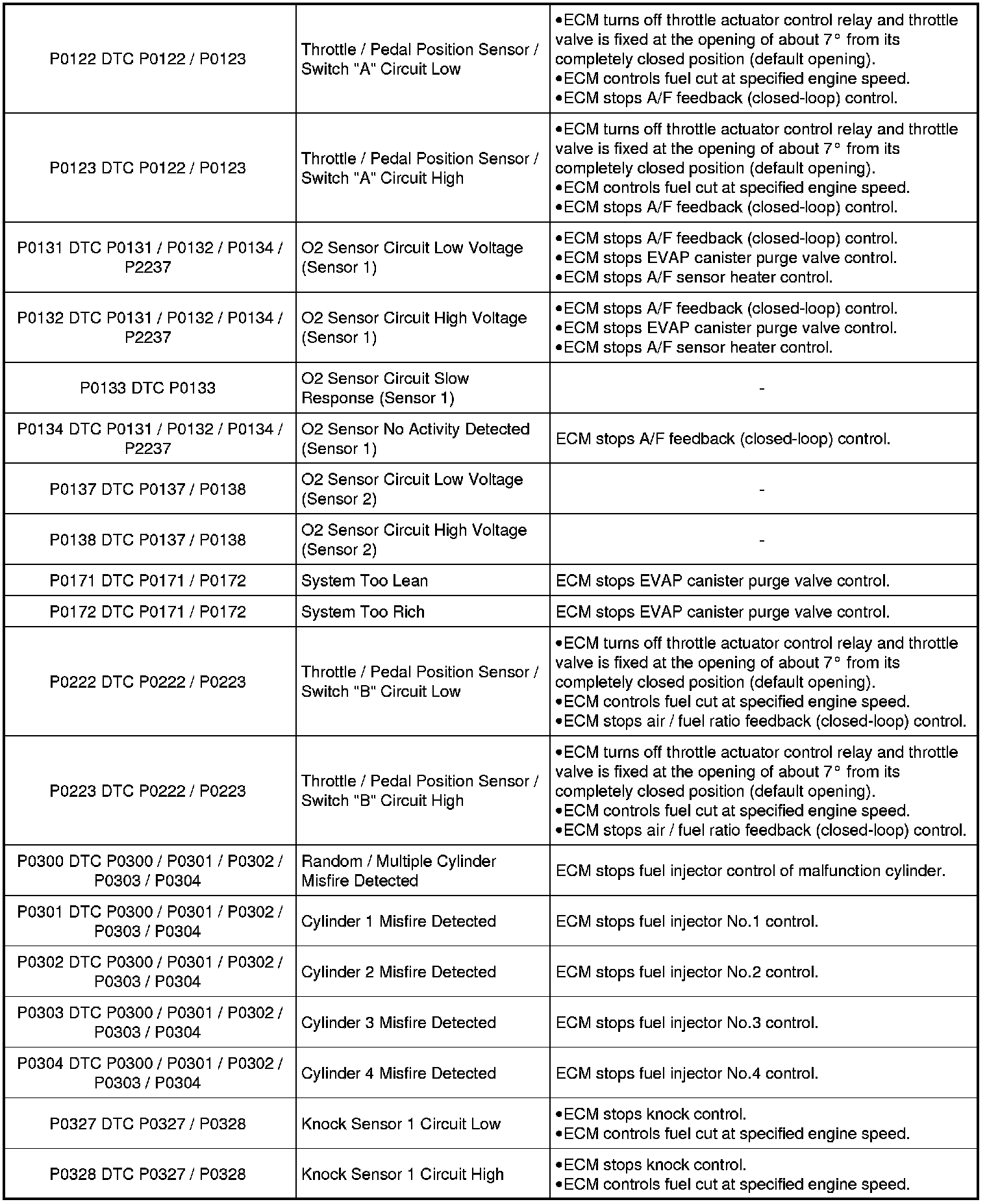 When any of the following DTCs is detected, ECM enters fail-safe mode as long as malfunction continues to exist but that mode is canceled when ECM detects normal condition.