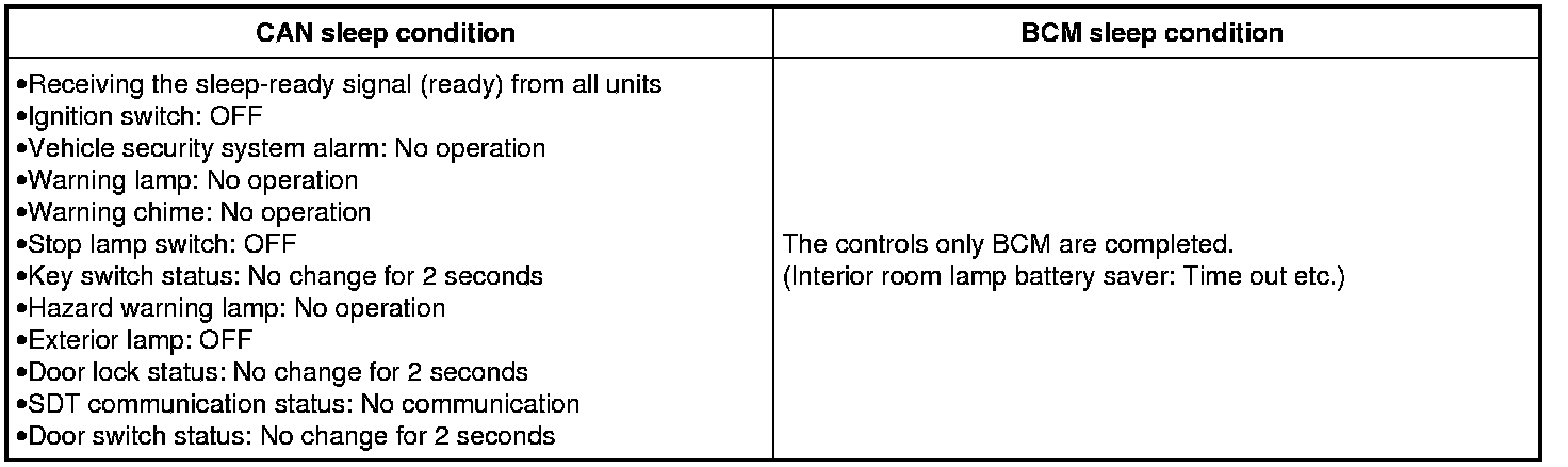 - BCM is in the low power consumption mode and perform the low power consumption control when all of the BCM sleep conditions are fulfilled with CAN sleep condition.