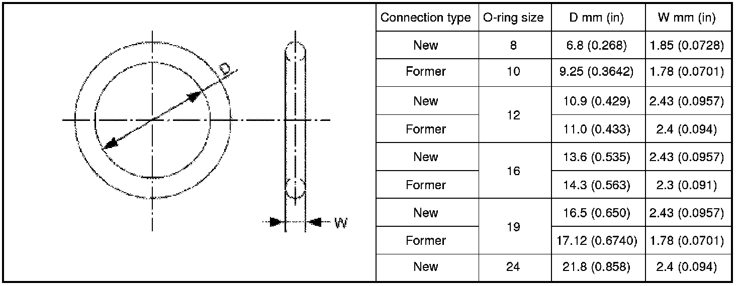 The new and former refrigerant connections use different O-ring configurations. Do not confuse O-rings since they are not interchangeable. If a wrong O-ring is installed, refrigerant will leak at or around the connection.
