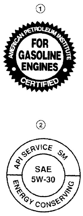 SUZUKI recommends the use of an energy conserving oil in order to improve fuel economy. Select only engine oils that meet the American Petroleum Institute (API) certification and International Lubricant Standardization and Approval Committee (ILSAC) certification and SAE viscosity standard (2). These oils have the API certification mark (1) on the front of the container. Oils which do not have the specified quality label should not be used as they could cause engine damage.