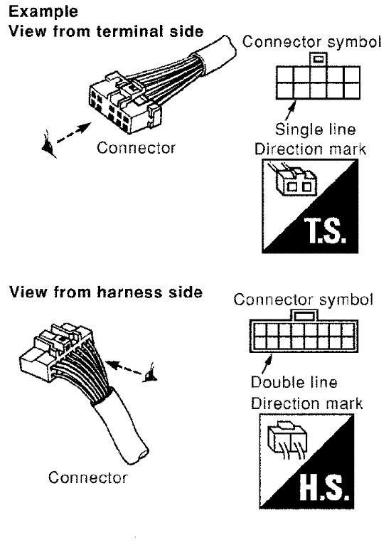 - Connector symbols shown from the harness side are enclosed by a double line and followed by the direction mark.