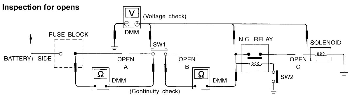 - Connect the other probe to the fuse block (power) side of SW1. Little or no resistance will indicate that portion of the circuit has good continuity. If there were an open in the circuit, the DMM would indicate an over limit or infinite resistance condition. (point A)