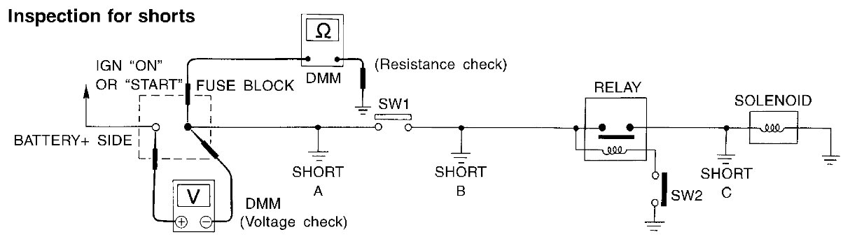 - Remove the blown fuse and disconnect all loads (i.e. SW1 open, relay disconnected and solenoid disconnected) powered through the fuse.