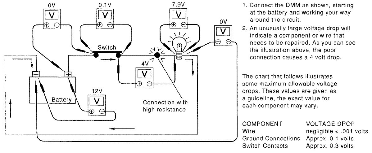 - The step by step voltage drop test can identify a component or wire with too much resistance.