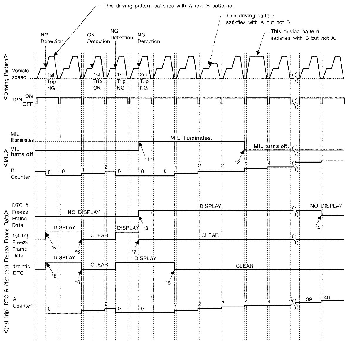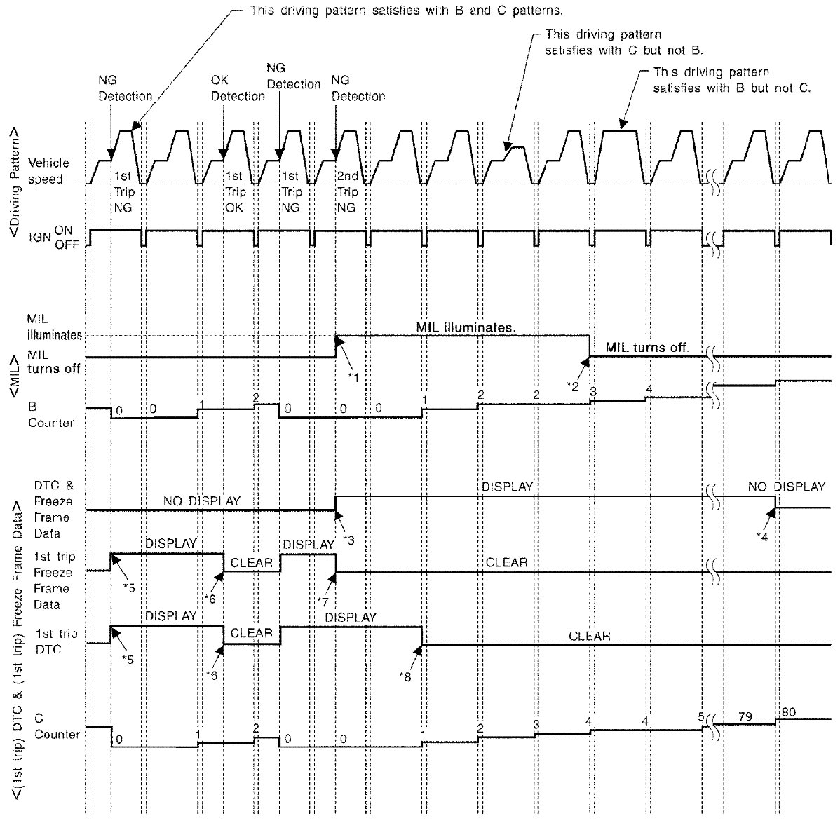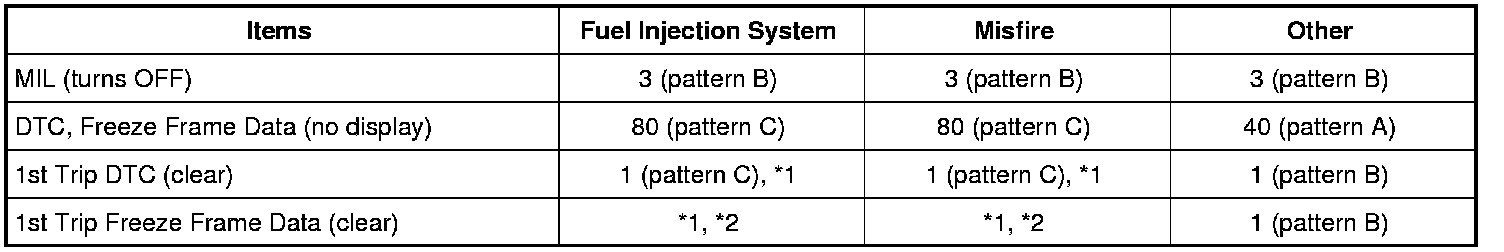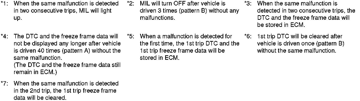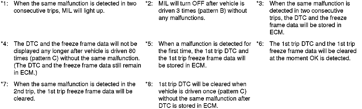 - The DTC and the freeze frame data will be stored until the vehicle is driven 40 times (driving pattern A) without the same malfunction recurring (except for Misfire and Fuel Injection System). For Misfire and Fuel Injection System, the DTC and freeze frame data will be stored until the vehicle is driven 80 times (driving pattern C) without the same malfunction recurring. The "TIME" in "DTC check" mode of SDT will count the number of times the vehicle is driven.