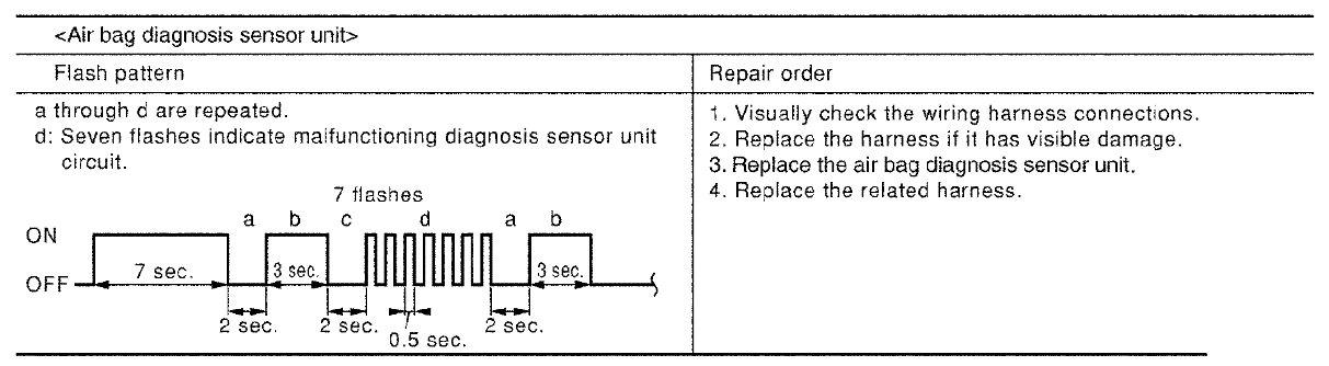 Follow the procedures in numerical order when repairing malfunctioning parts. Confirm whether malfunction is eliminated using air bag warning lamp each time repair is finished. If malfunction is still observed, proceed to the next step. When malfunction is eliminated, further repair work is not required.