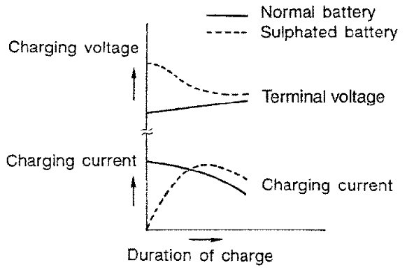 - To determine if a battery has been "sulfated", note its voltage and current when charging it. As shown in the figure, less current and higher voltage are observed in the initial stage of charging sulfated batteries.