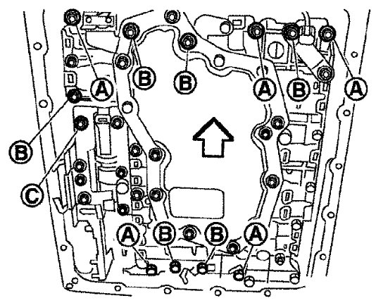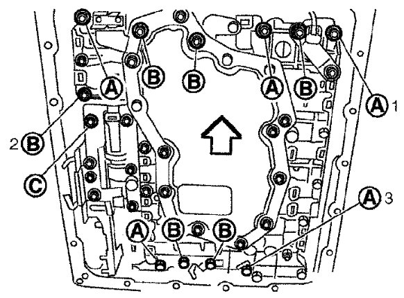 27) Tighten bolt (1A), (2B) and (3A) temporarily to prevent dislocation. After that tighten them in order (1 -> 2 -> 3). Then tighten other bolts. Tighten control valve with TCM bolts to the specified torque.