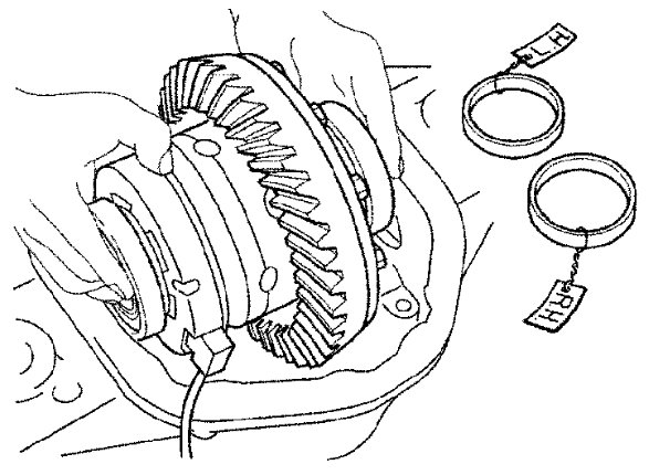 10) Remove the differential case assembly, keep side bearing outer races together with inner races. Do not mix them up. Also, keep side bearing adjusters together with bearing.