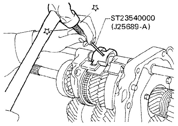 3) Install striking rod into hole of shift forks, striking lever and interlock and then install new retaining pin into striking lever using Tool.