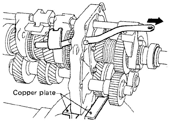 4) While pulling out striking rod, remove striking lever and striking interlock. Then remove 1st and 2nd, 3rd and 4th, and reverse shift forks.