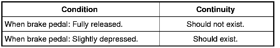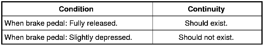3) Check harness continuity between stop lamp switch terminals 1 and 2 under the following conditions.