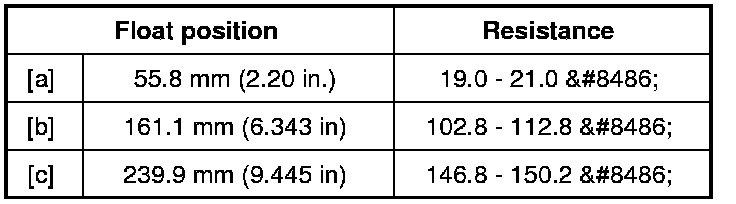 Check resistance between terminals (1) and (2) at each float position [a], [b] and [c].