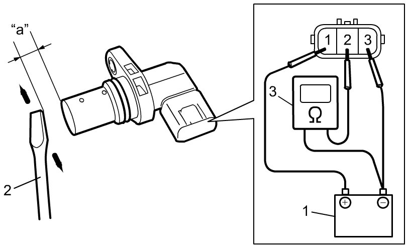 a) Connect battery (1) and ohmmeter (3) to CMP sensor as shown in figure.