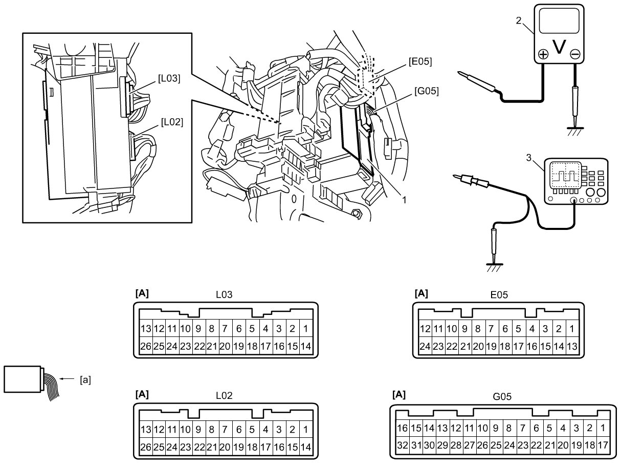 Check voltage and/or pulse signal of BCM (1) using voltmeter (2) and oscilloscope (3).