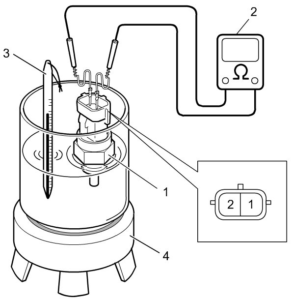 - Check resistance between terminals "1" and "2". Make sure its resistance decreases as its temperature increases.