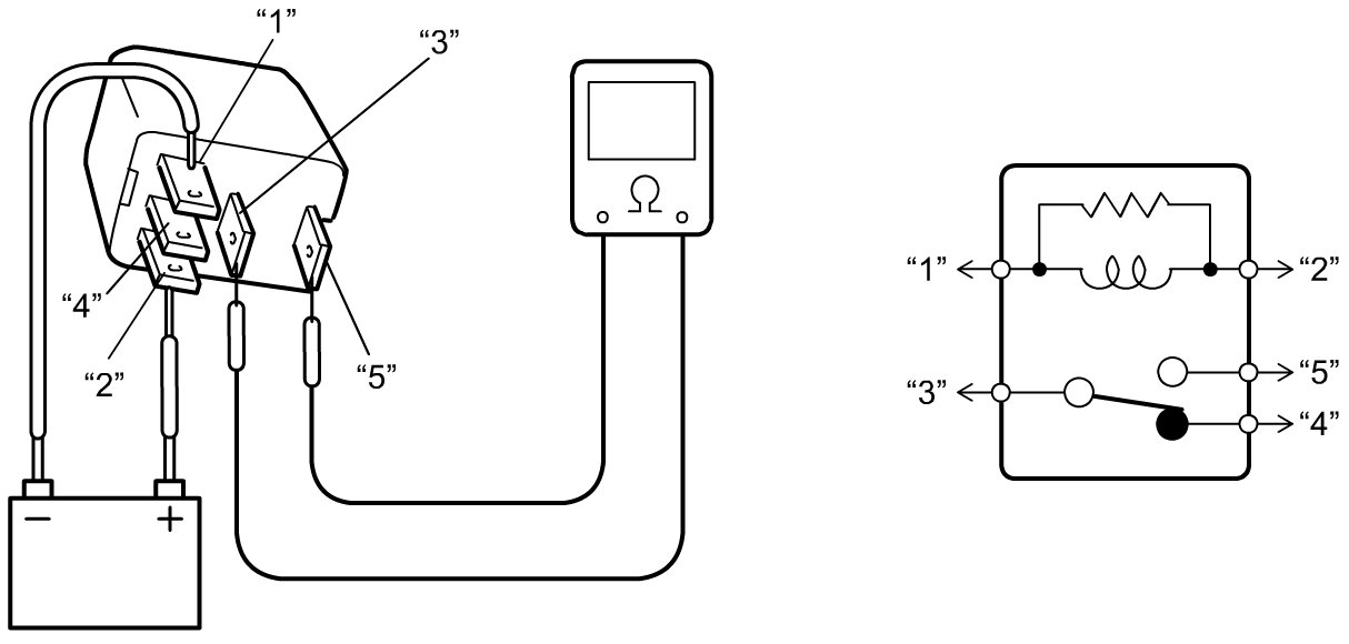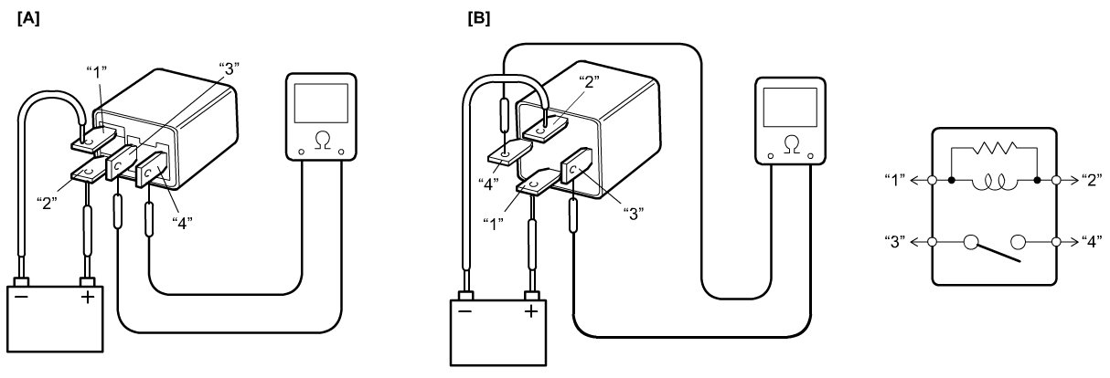 4) Connect battery positive (+) terminal and negative (-) terminal to relay as shown in figure, check for continuity between terminal "3" and "4".
