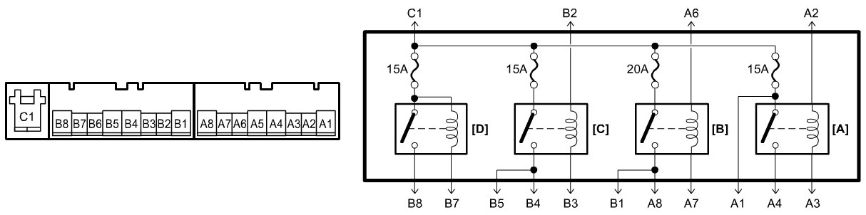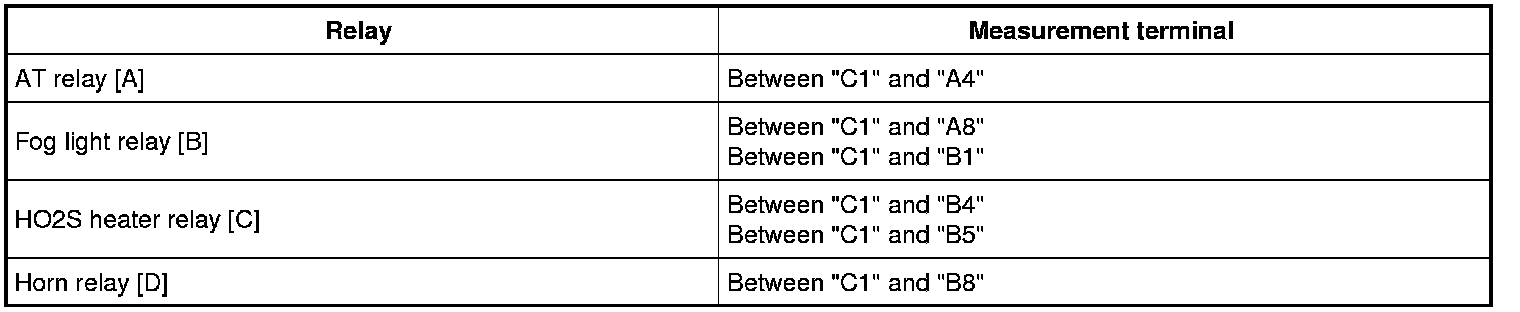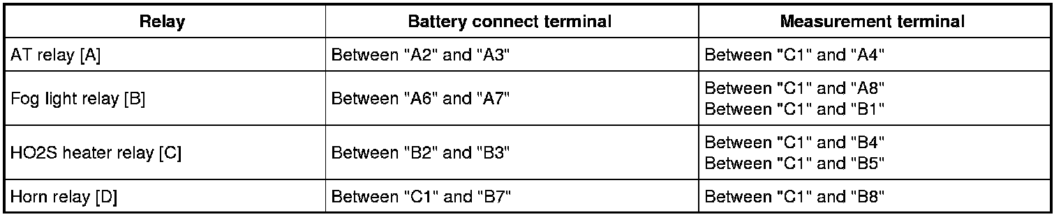 3) Following the table, for each relay, check continuity between switch side terminals when battery voltage is acting between coil side terminals.