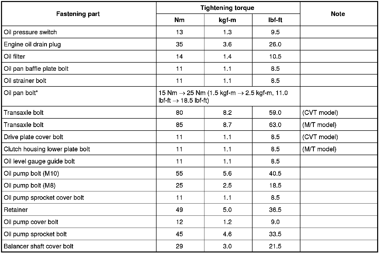 Tightening Torque Specifications