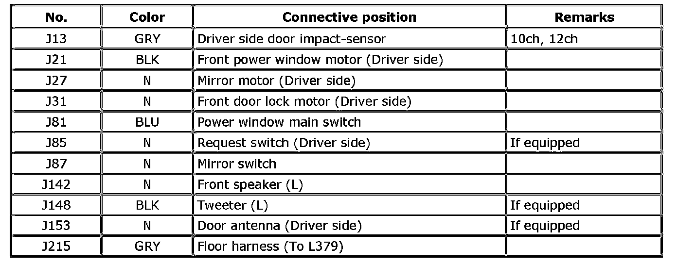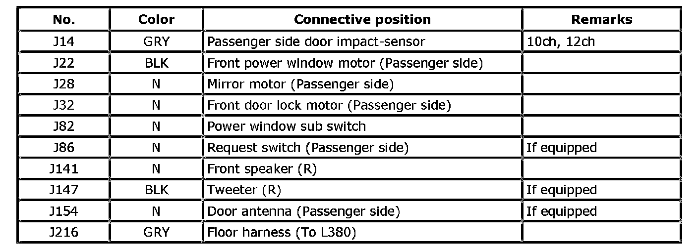 J: Front and Rear Door Wire and Rear Door Wire / K: Roof Wire, Roof Audio Antenna Wire (Hatchback)