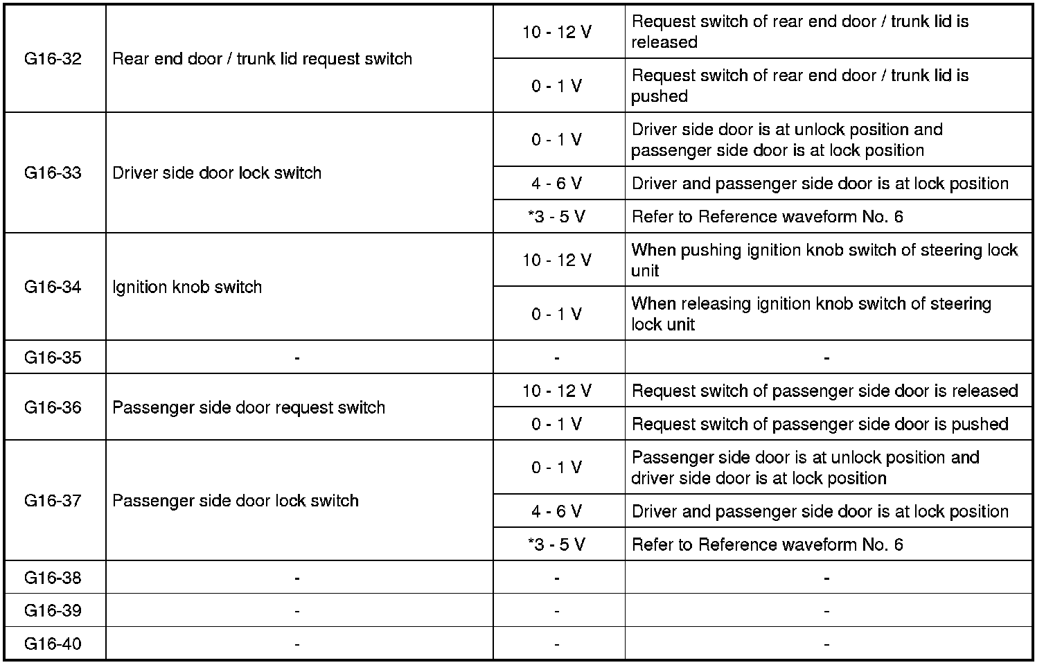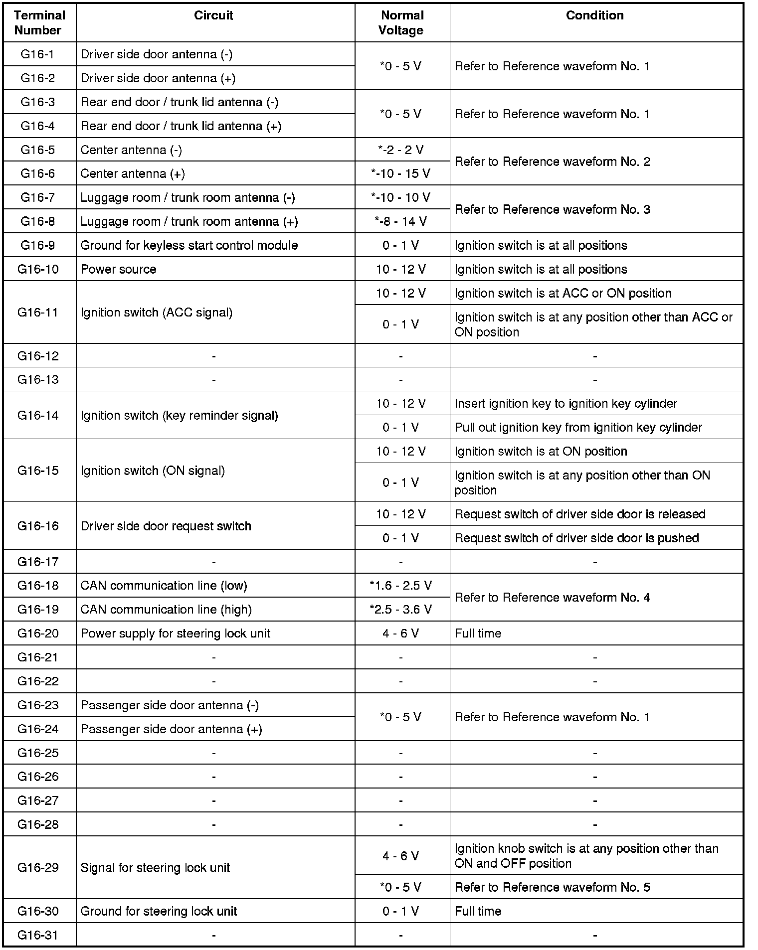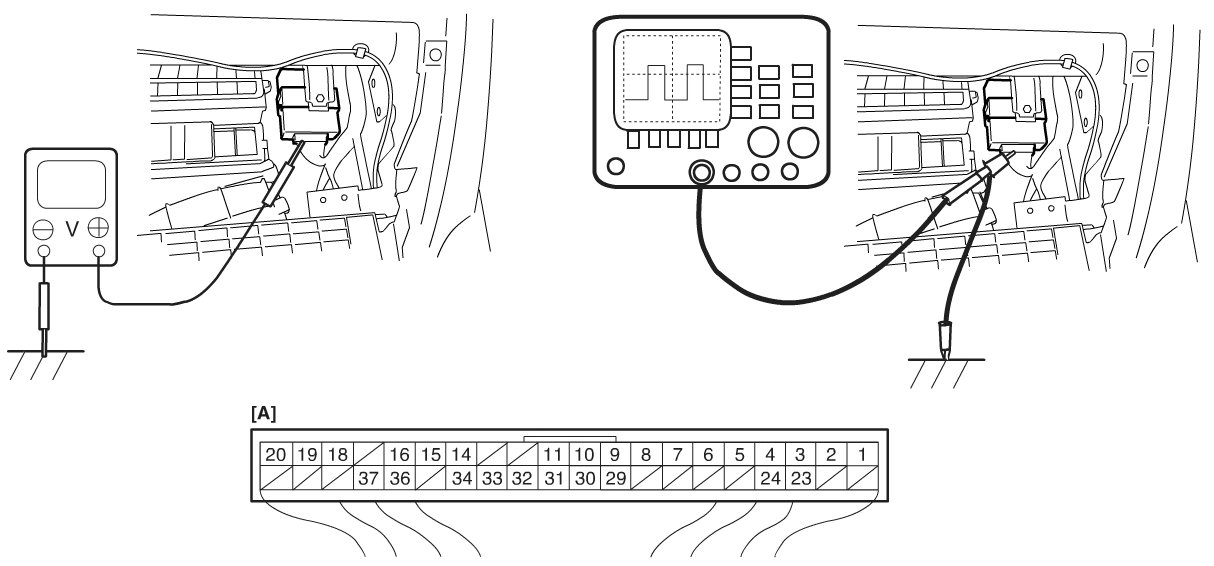 - As each terminal voltage is affected by the battery voltage, confirm that it is 11 V or more when ignition switch is ON.