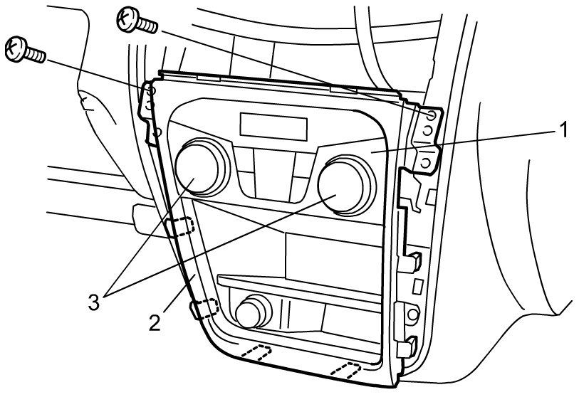 2) Remove HVAC control module (1) with its garnish (2) from instrument panel.