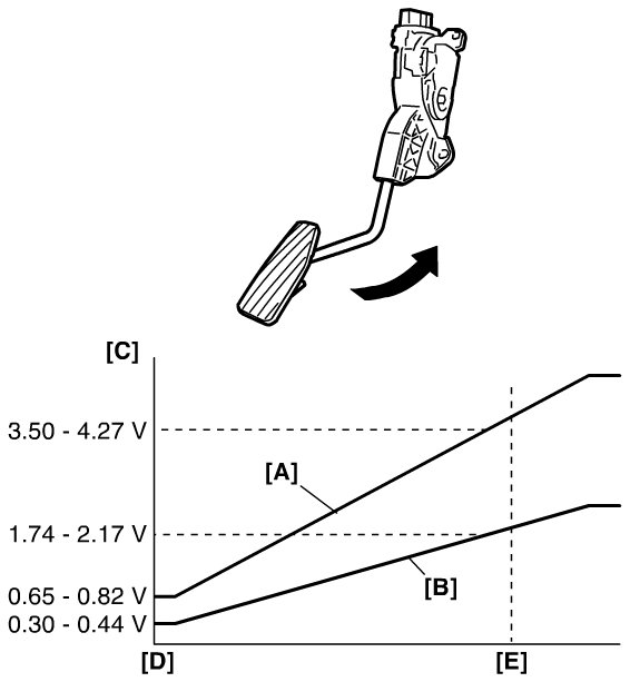If sensor voltage is out of specified value or does not vary linearly as the following graph, check APP sensor assembly referring to Accelerator Pedal Position (APP) Sensor Assembly Inspection Accelerator Pedal Position (APP) Sensor Assembly Inspection.