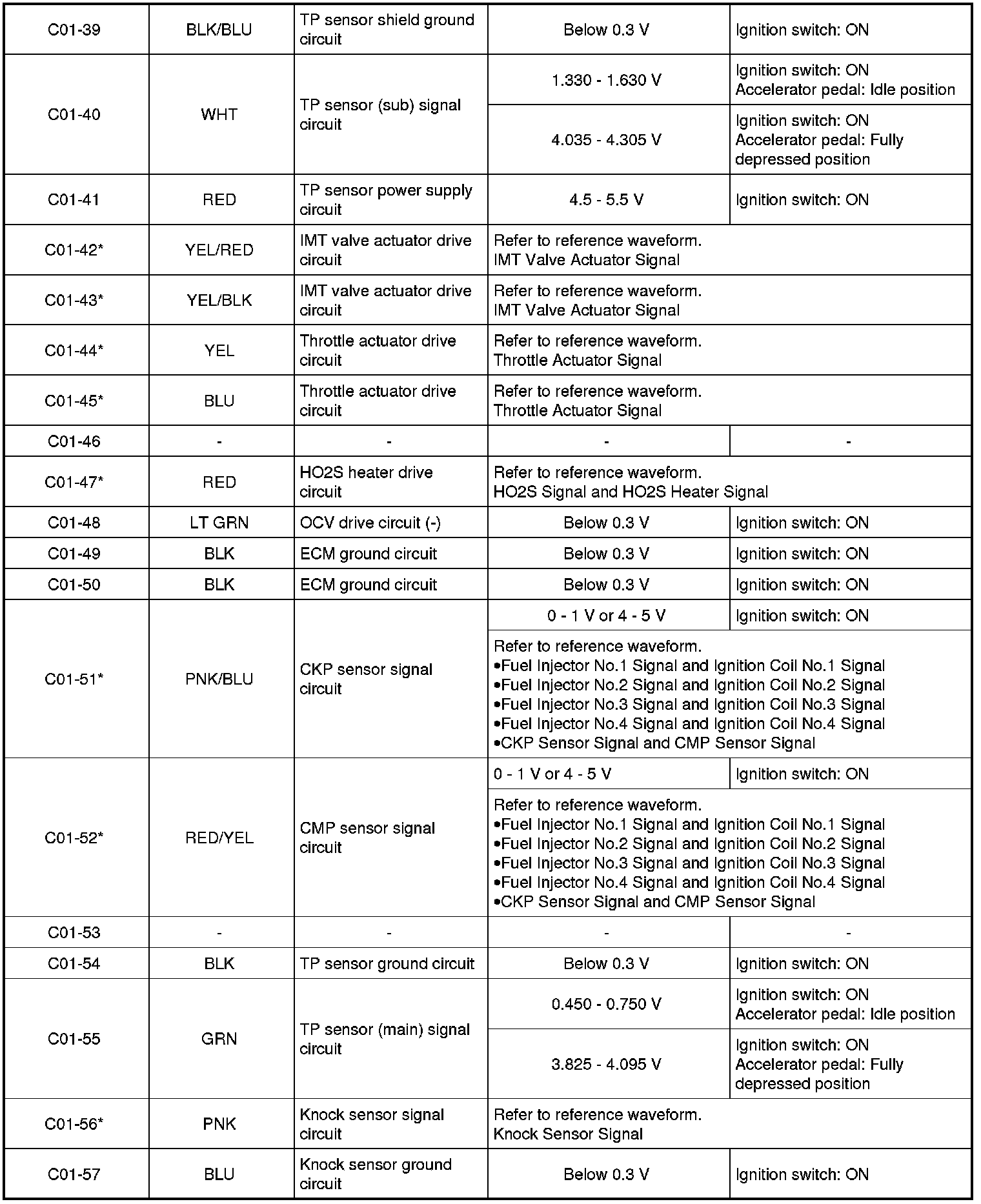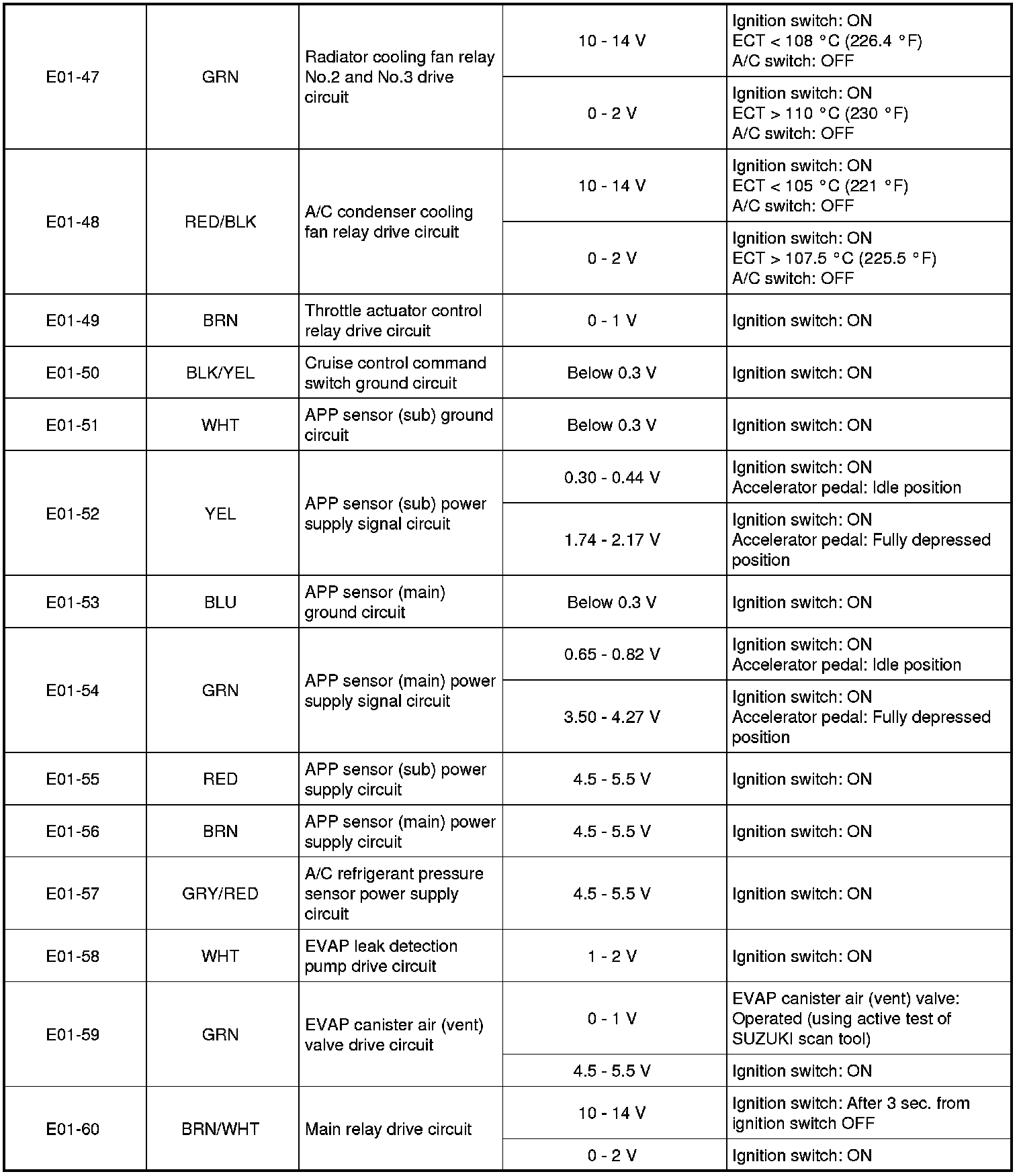 Home >> Suzuki >> 2012 >> SX4 2WD L4-2.0L >> Repair and Diagnosis >> Powertrain Management >> Computers and Control Systems >> Engine Control Module >> Testing and Inspection >> Pinout Values and Diagnostic Parameters >> Part 1
