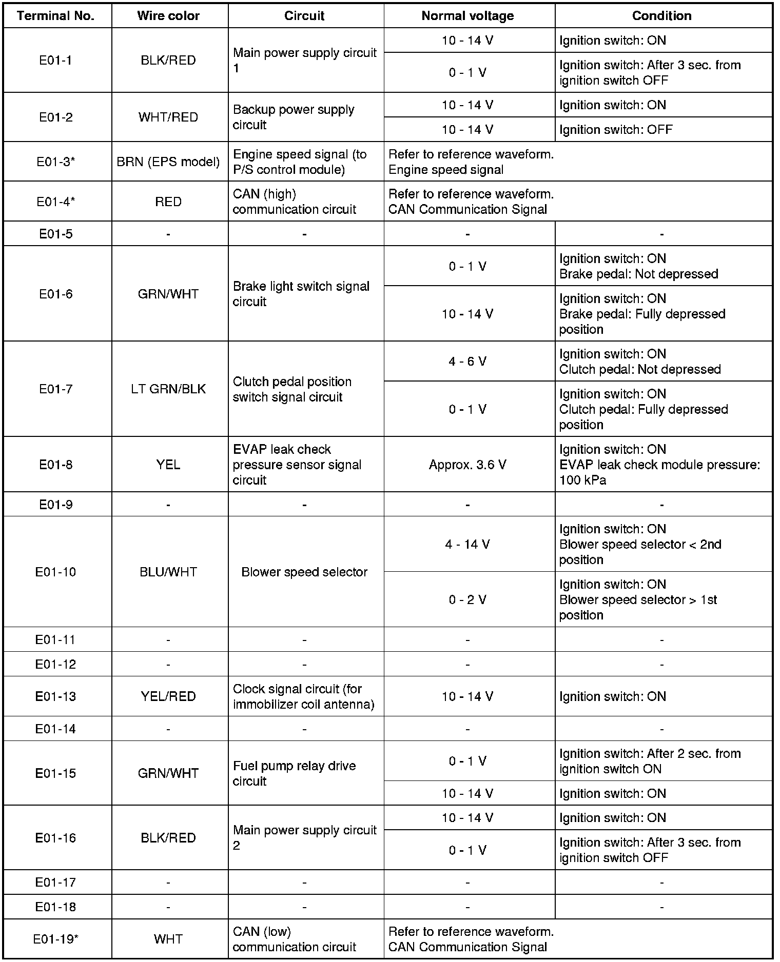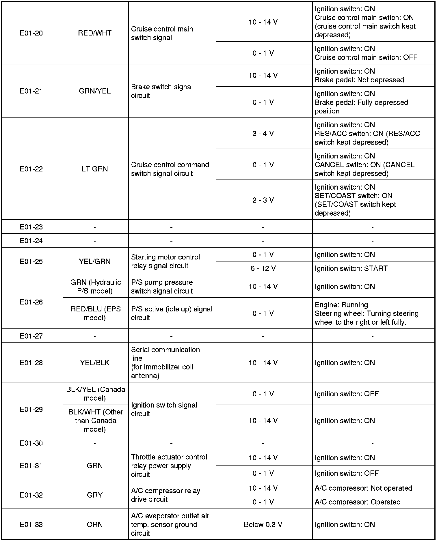 - As each terminal voltage is affected by battery voltage, confirm that it is 11 V or more when ignition switch is turned to ON position.