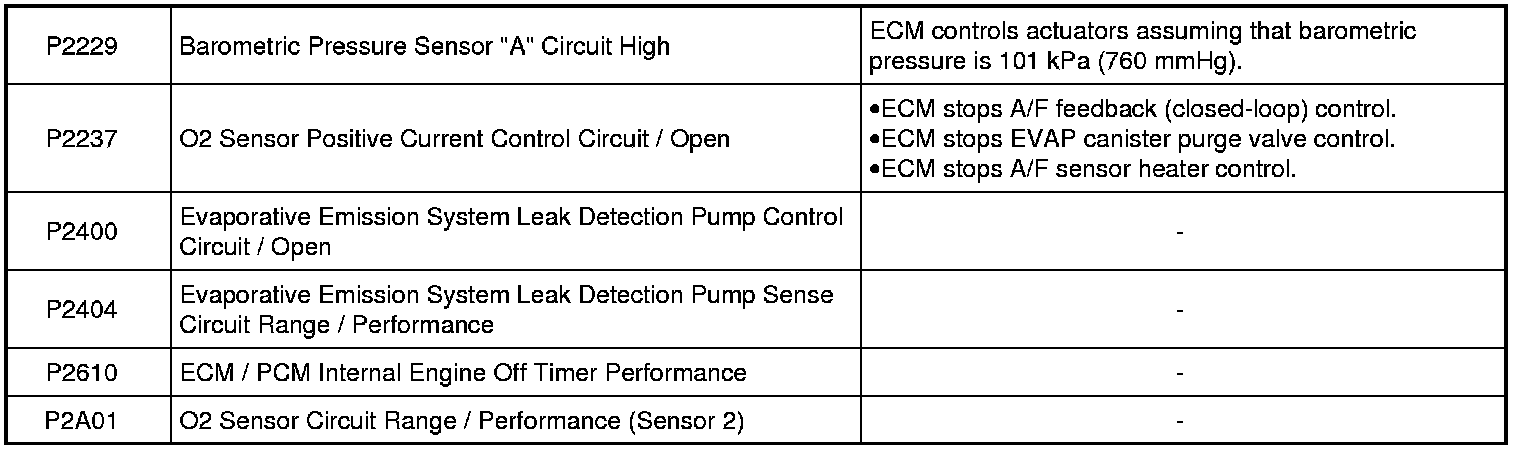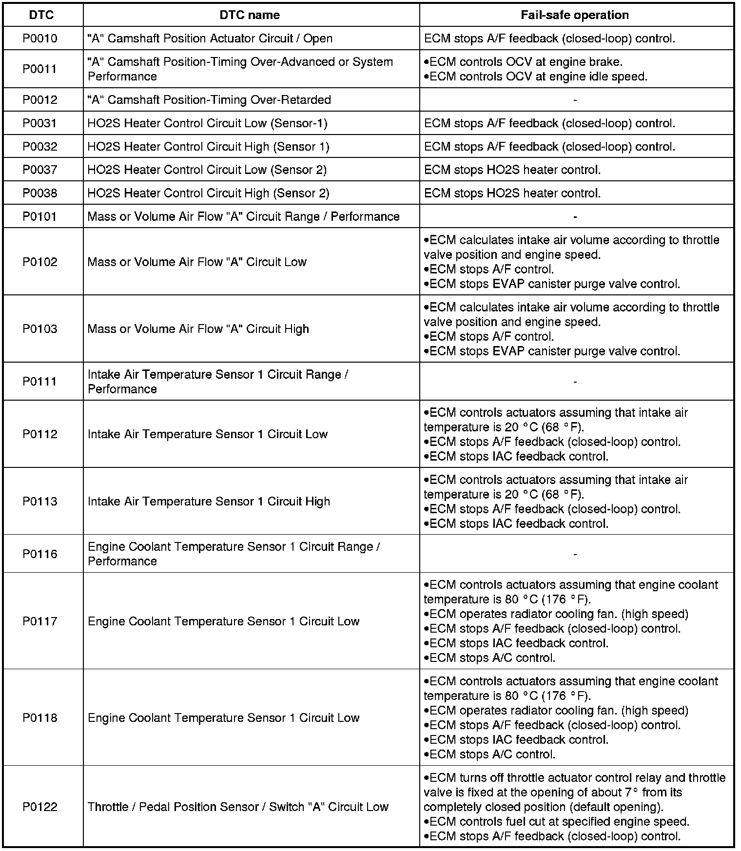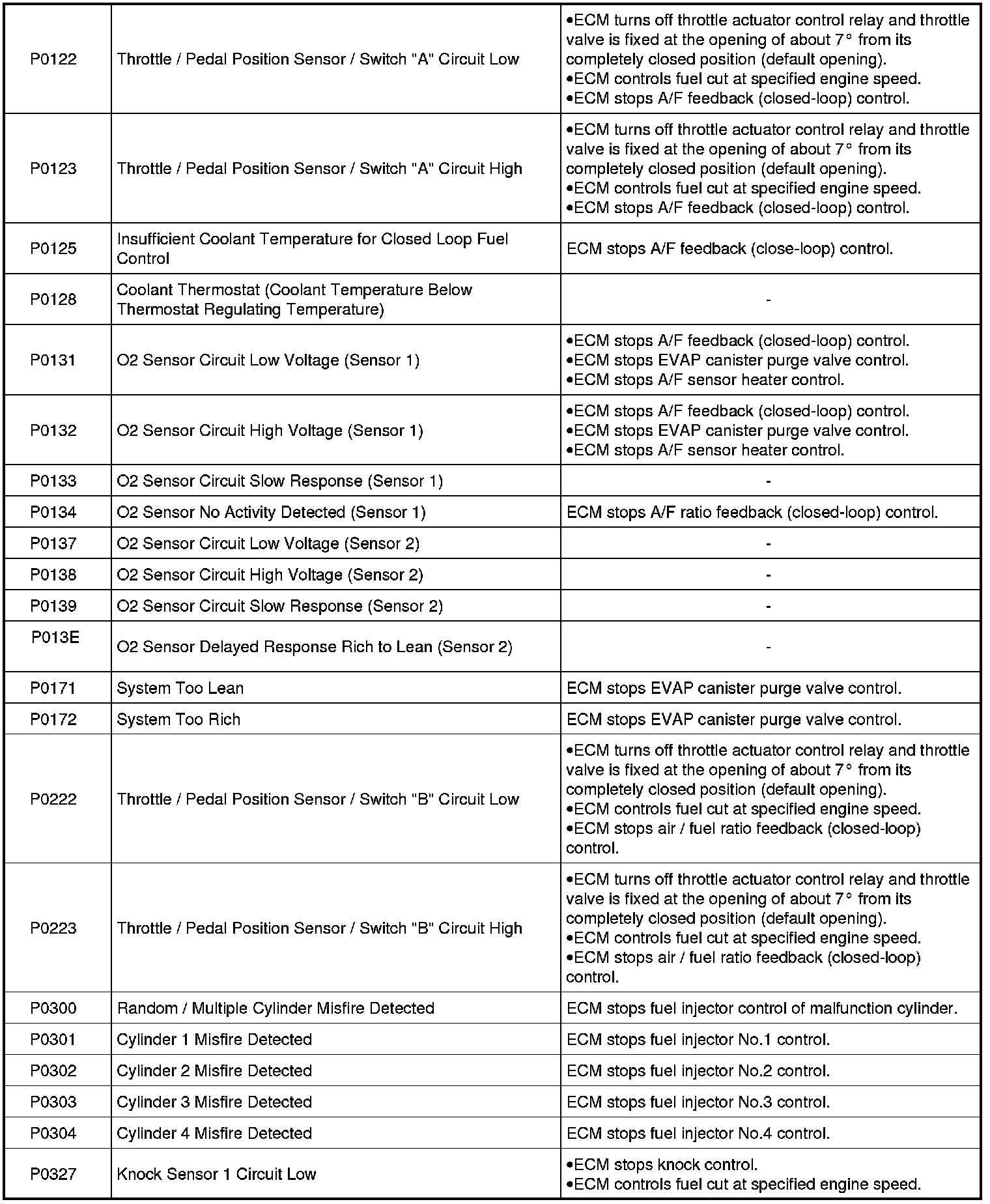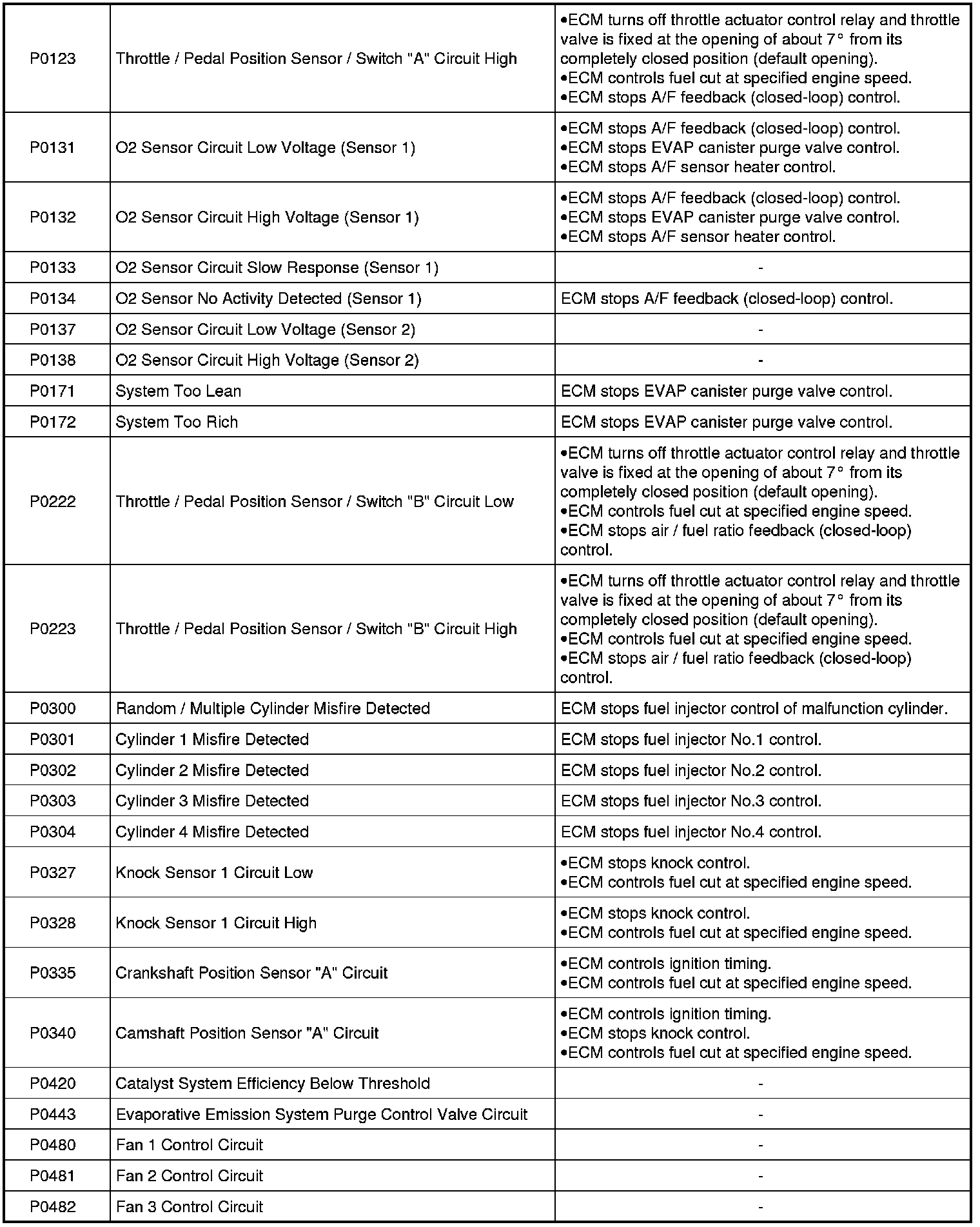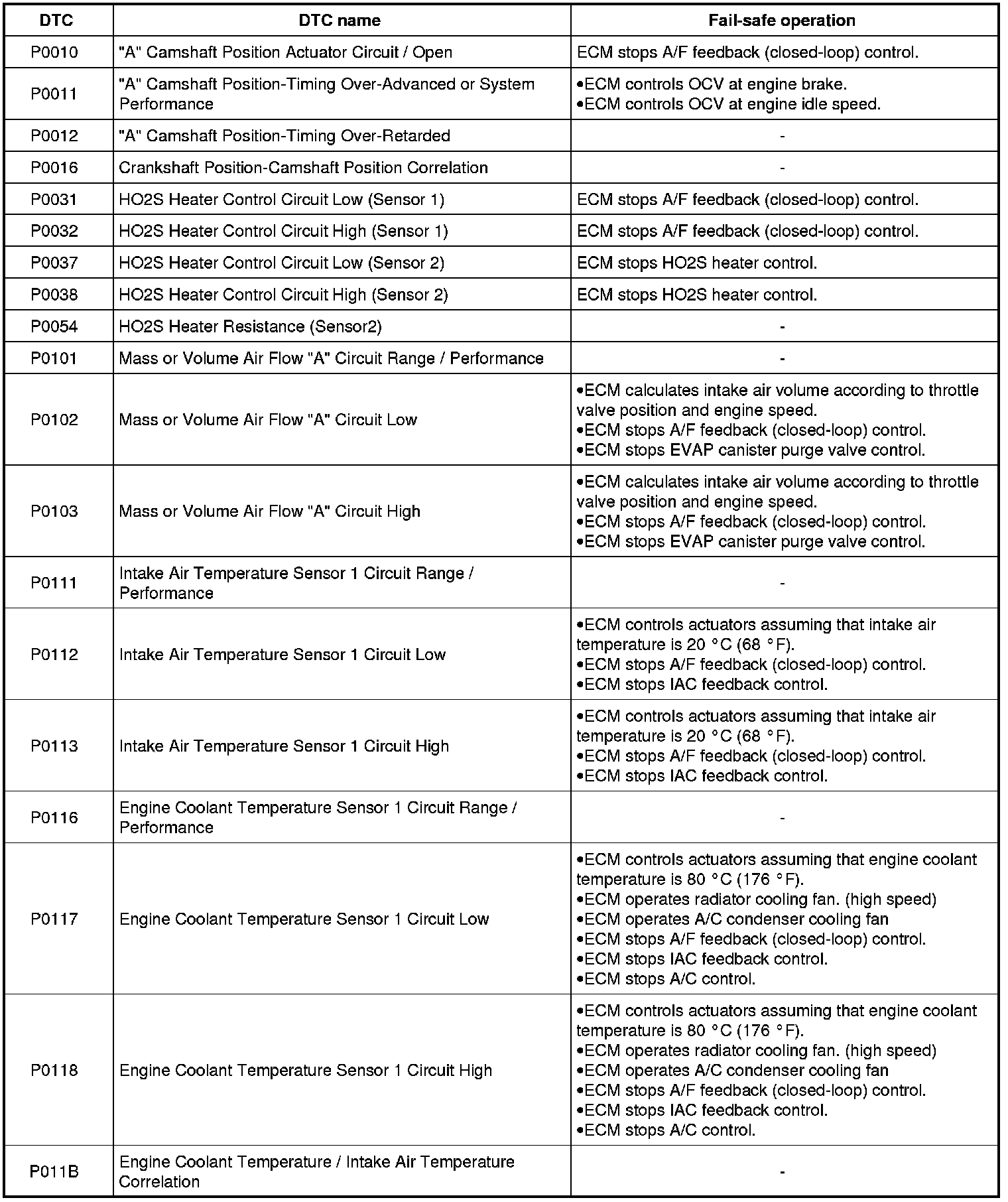 When any of the following DTCs is detected, ECM enters fail-safe mode as long as malfunction continues to exist but that mode is canceled when ECM detects normal condition.