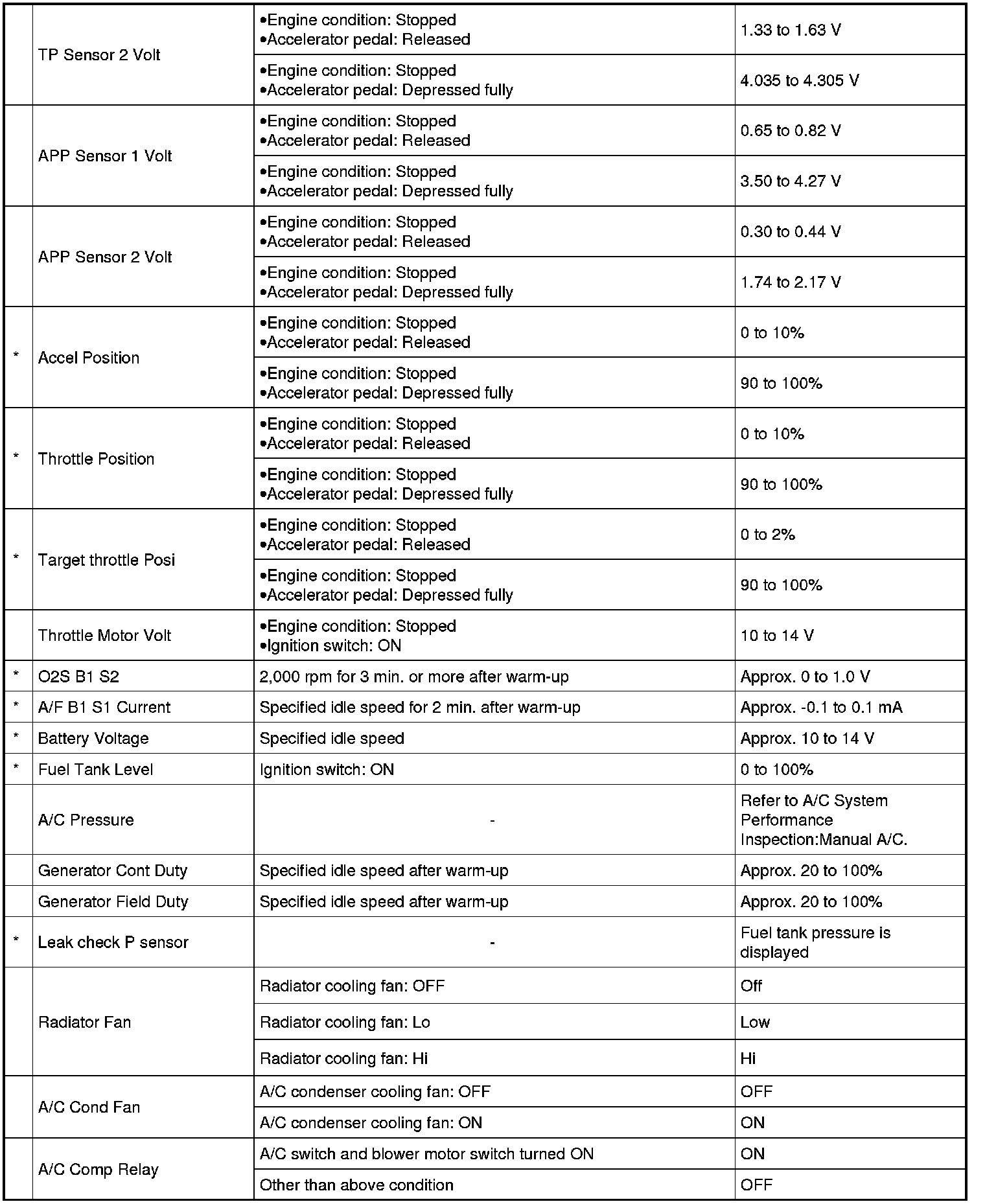 - With the generic scan tool, only star (*) marked data in the following table can be read.