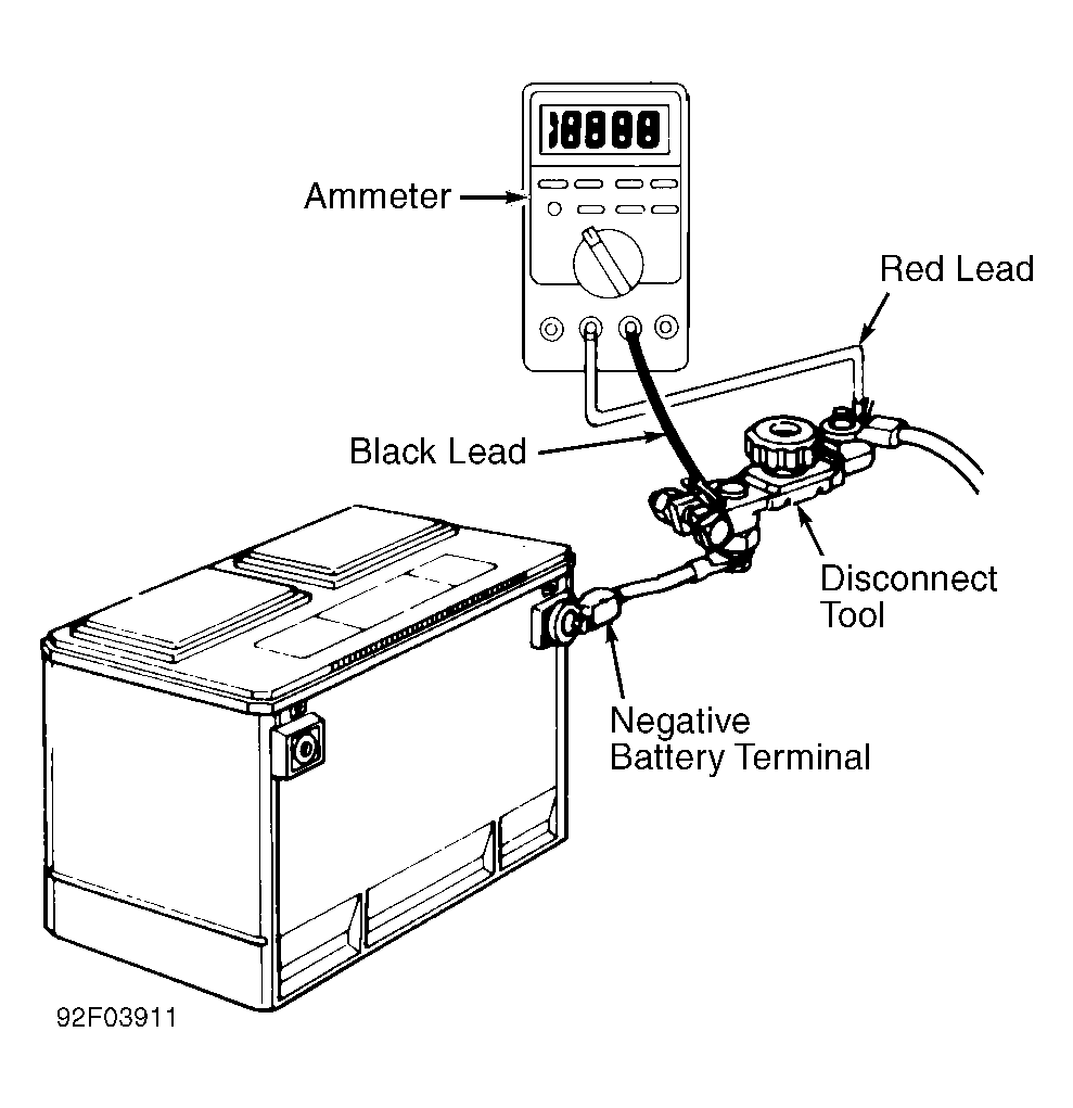 1. Turn ignition off. Remove negative battery terminal cable. Install Disconnect Tool (J-38758) test switch male end to negative battery cable. Turn test switch knob to OFF position (current through meter). Install negative battery cable to the female end of test switch.