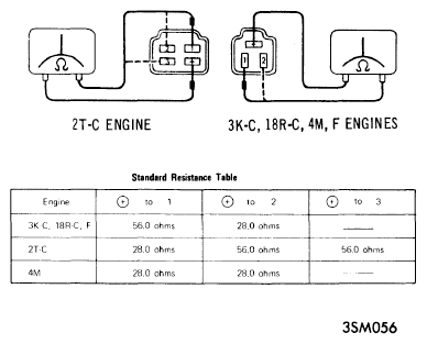 Unplug valve connector and measure resistance between (+) terminal and other terminals using a circuit tester. Replace valve if resistance is not to specified value. See Fig 1.