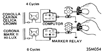 NOTE: On Land Cruiser models, connections should be as shown for Corolla, Carina, etc. but reading should be six cycles.